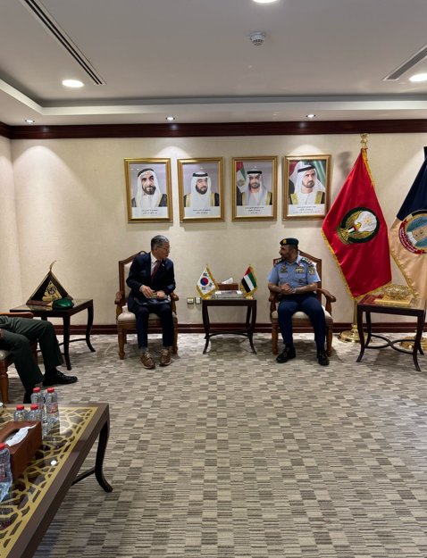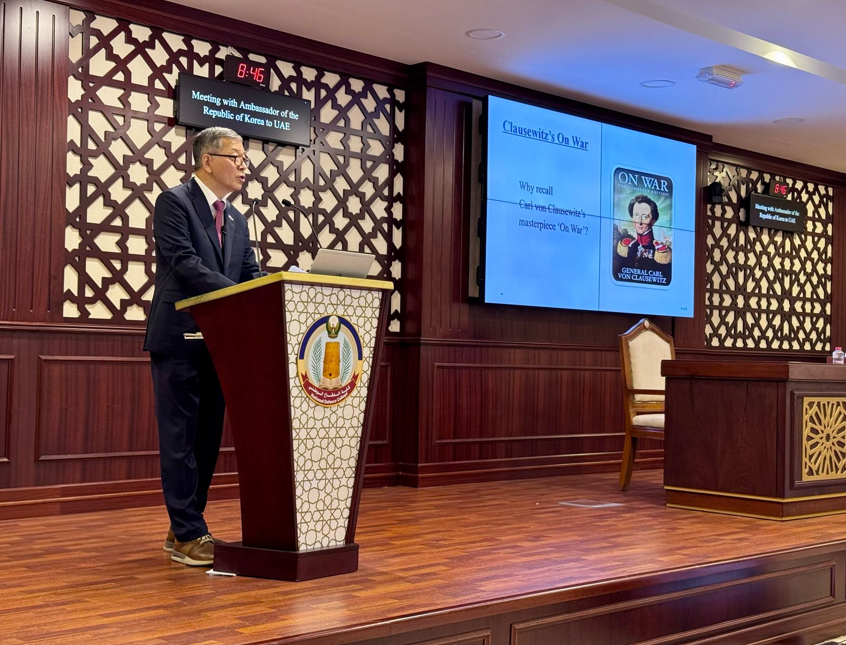 류제승 대사는 5.27.(화) UAE 국방대학교(National Defence College)에서 Saeed Hassan Alyammahi 총장, Rashed Ali Alkaabi 부총장, UAE 현역 군인·경찰 및 공무원 교육생 등 총 70여명을 대상으로 ‘전쟁을 알면 평화를 이룬다(Knowing War makes Peace)’를 주제로 강연을 실시했습니다.