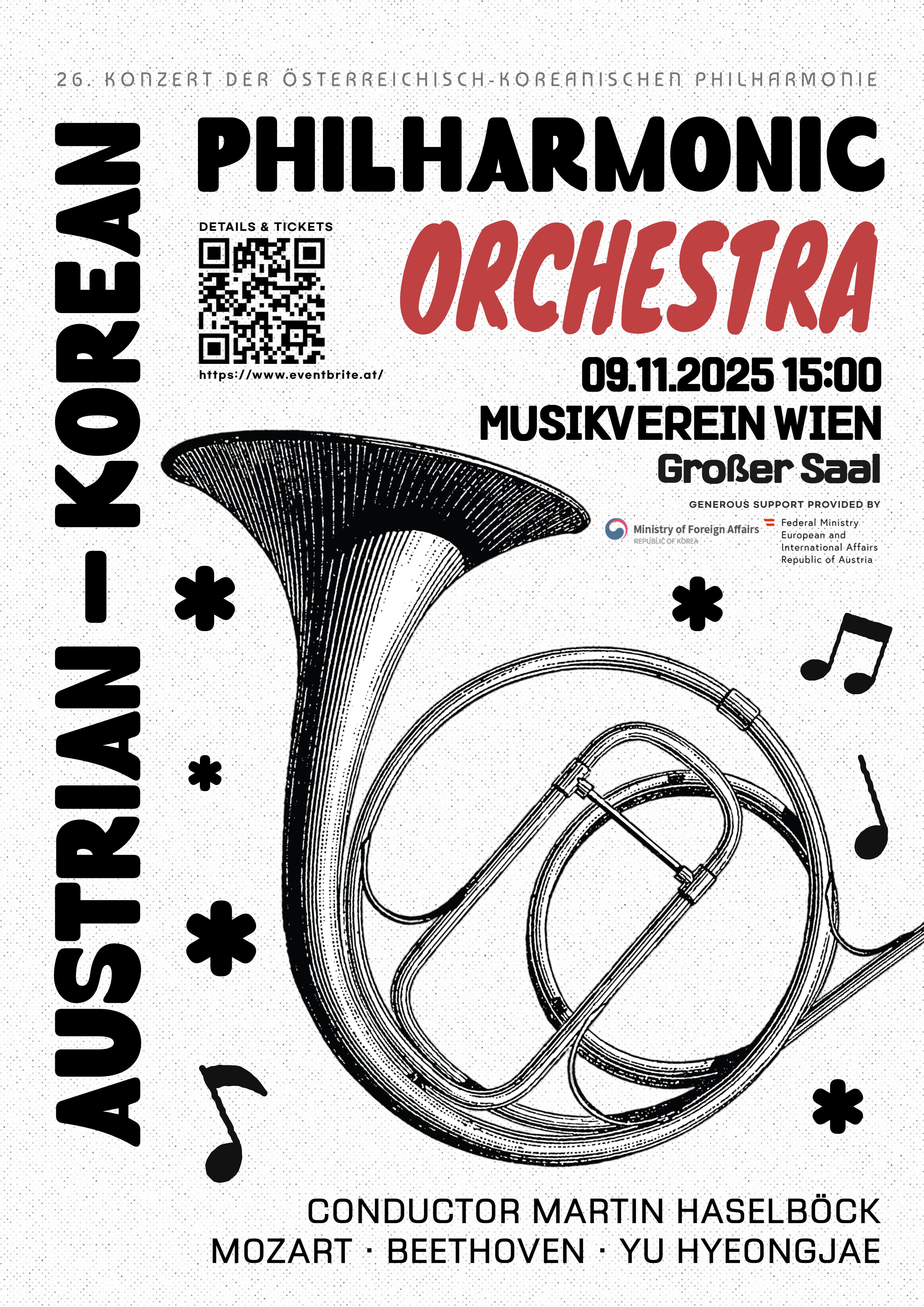 Das Konzert der Österreichisch-Koreanischen Philharmonie findet in diesem Jahr zum 26. Mal statt und wird am Sonntag, den 9. November, im Musikverein Wien (Großer Saal) aufgeführt. Wir freuen uns auf Ihre Teilnahme.