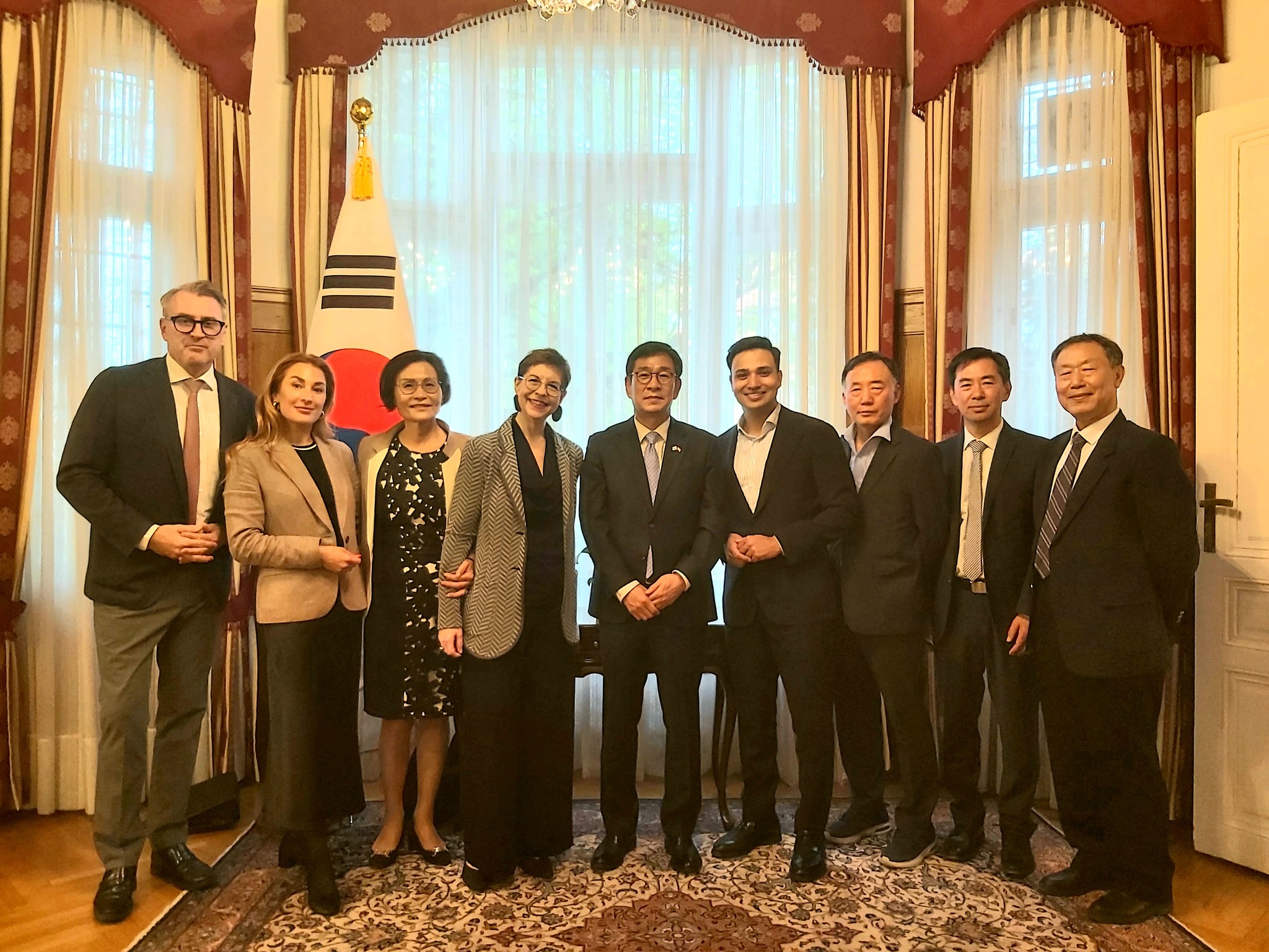 Attendees included Chairperson Christine Marek, Vice Chairpersons Yannick Shetty, Mi-ja Jeon, Chang-no Lim, and Jong-wan Jung; Secretary General Meinhard Friedl; Press Officer Marielouise Schütz; and Dukho Lee, President of the Korean Association in Austria.
