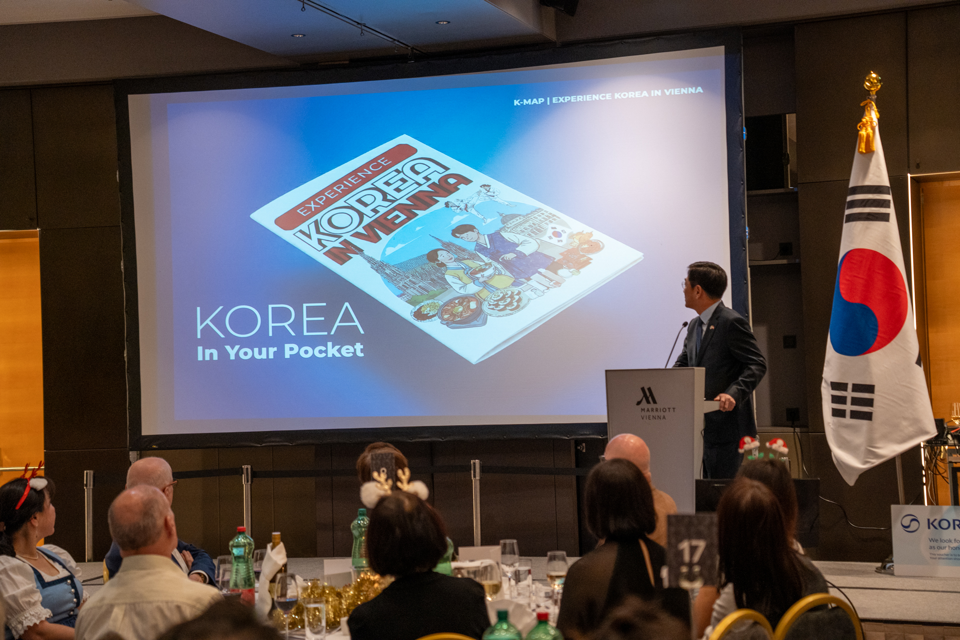 축사 말미에는 대사관이 최근 제작한 「K-Map」을 동포사회에 소개하고, 「K-Map」을 통해 오스트리아 시민과 관광객들이 한인 업소와 K-문화를 자연스럽게 접하는 가운데, 한인 비즈니스가 보다 활성화 되고, 우리 동포사회의 위상이 제고되기를 기대한다고 하였습니다.