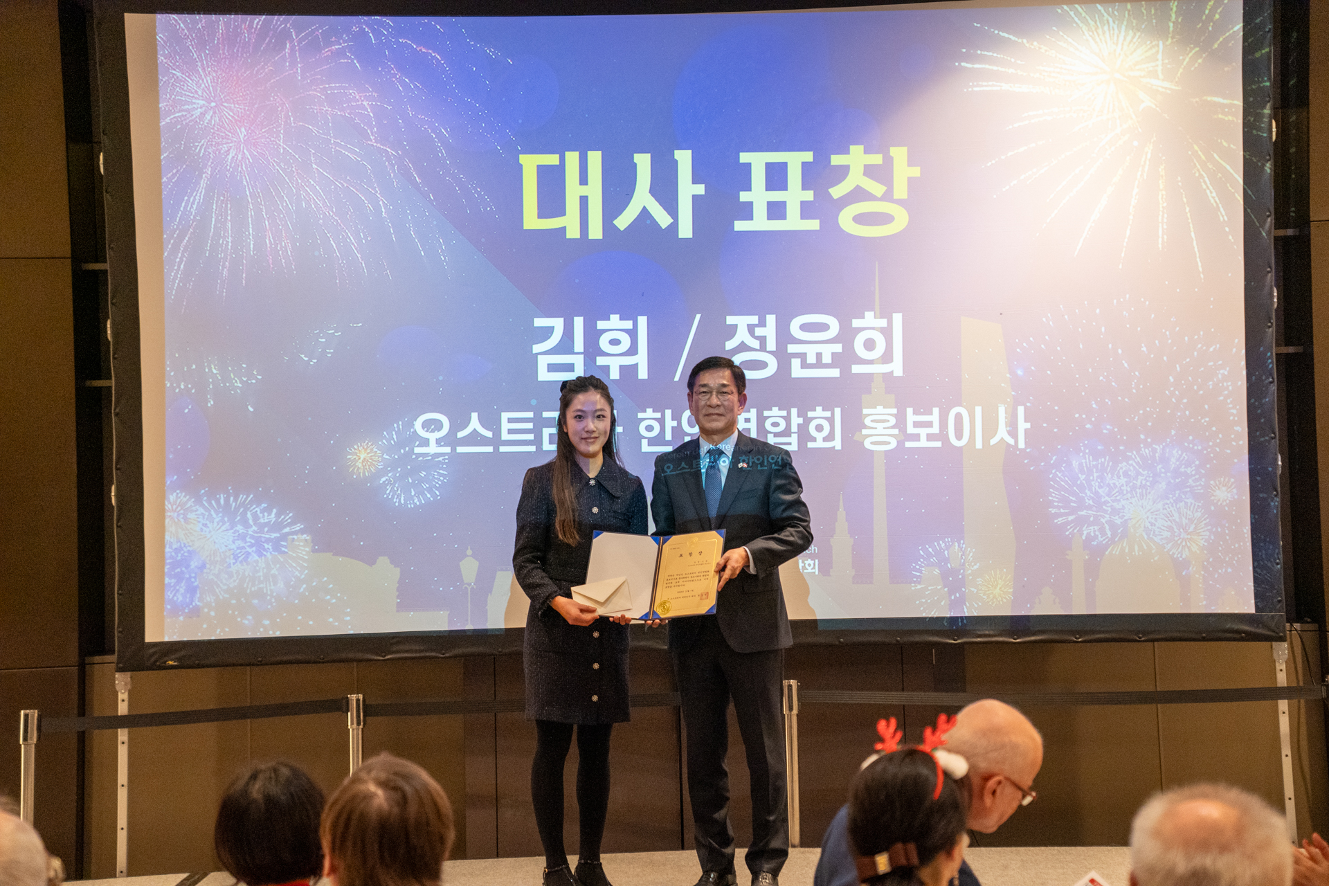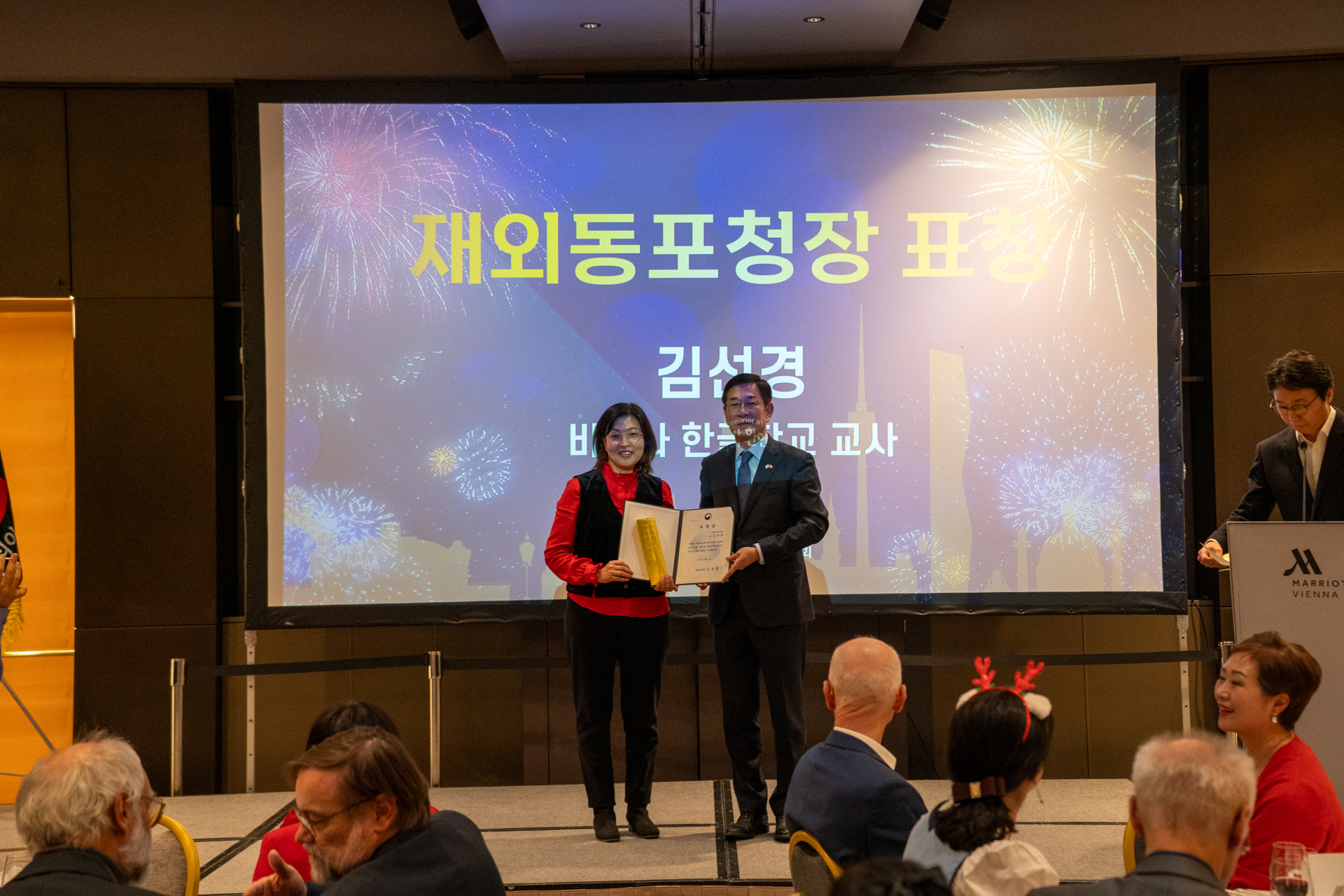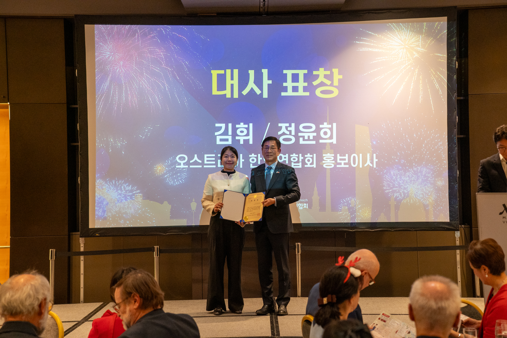 한편, 함 대사는 제19회 세계한인의날 유공 포상으로 김선경 비엔나한글학교 교사에게 재외동포청장 표창장을 전수하였고, 김 휘, 정윤희 재오스트리아한인연합회 홍보이사에게 동포사회에서의 다양한 공로를 높이 평가하여 대사 표창을 수여하였습니다.