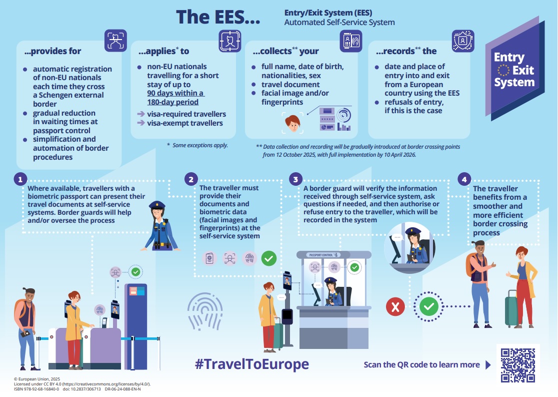 2025.10.12.(일)부터 오스트리아를 포함한 EU 회원국은 새로운 출입국 관리 제도인 EU출입국관리시스템, EES(Entry/Exit System)을 단계적으로 시행할 예정입니다. 이에 따라, 오스트리아로 입국을 준비하시는 분들께서는 아래 내용을 참고하시기 바랍니다.