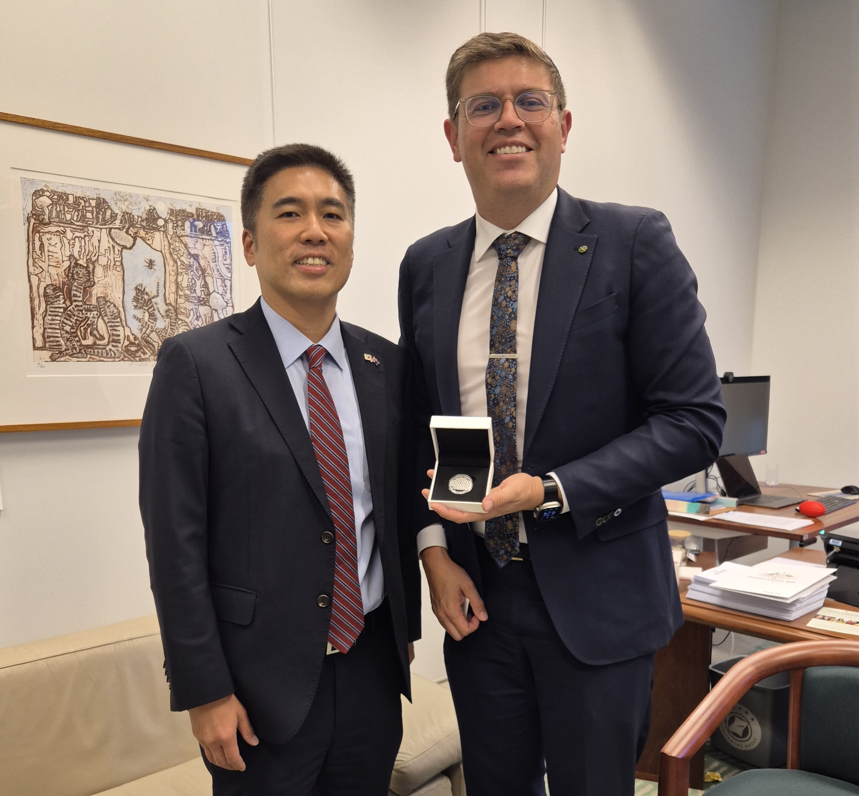 Mr Jimin Kim, Chargé d’Affaires a.i. of the Embassy of the Republic of Korea in Australia, met with Mr Jerome Laxale MP, Chair of the Australia–Korea Parliamentary Friendship Group, on 27 November to discuss future directions for the Group and ways to further enhance bilateral cooperation.