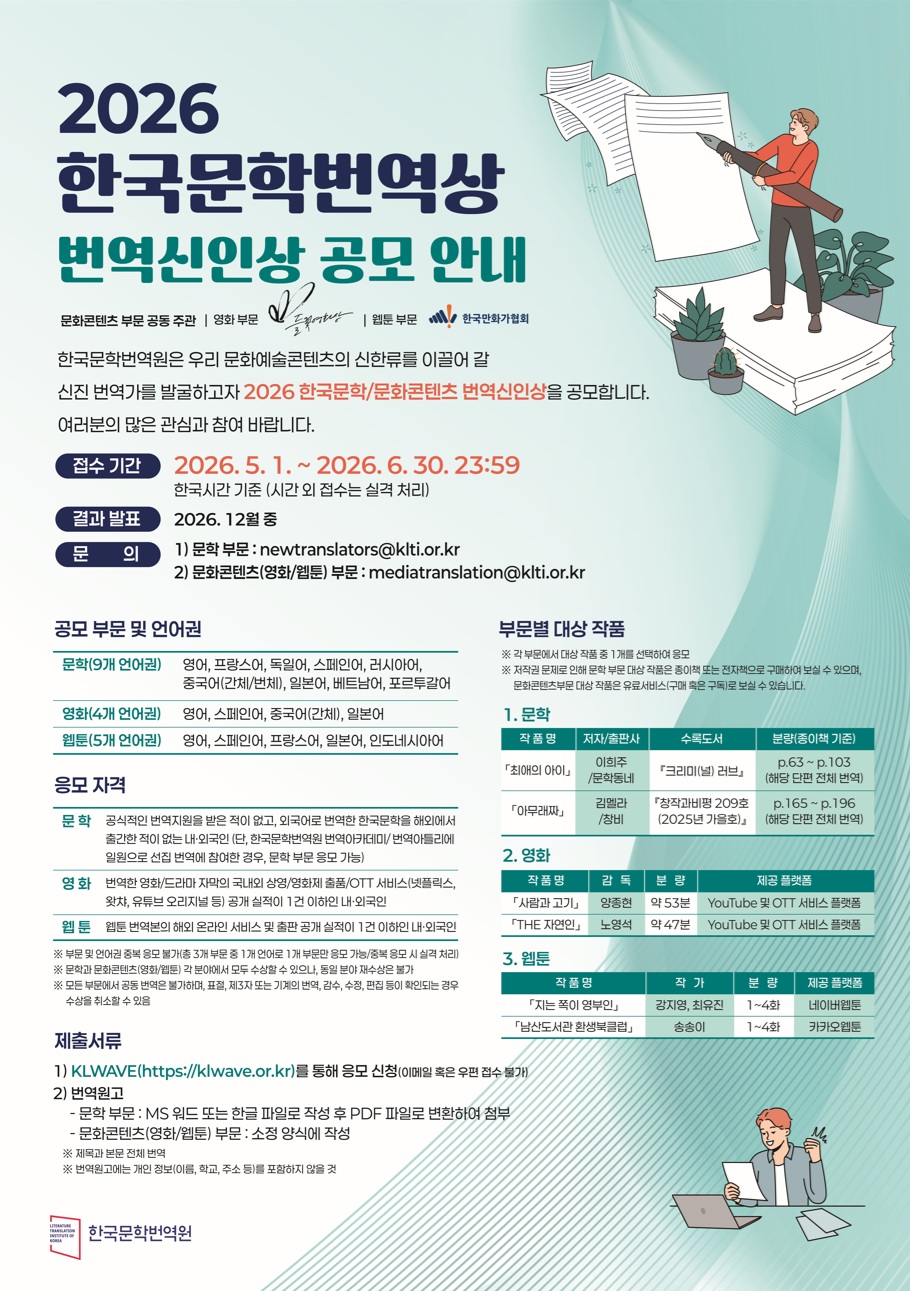 응모 자격 및 부문별 대상작품 등 보다 자세한 사항은 번역원 홈페이지 및 KLWAVE에서 확인해 주시기 바랍니다.