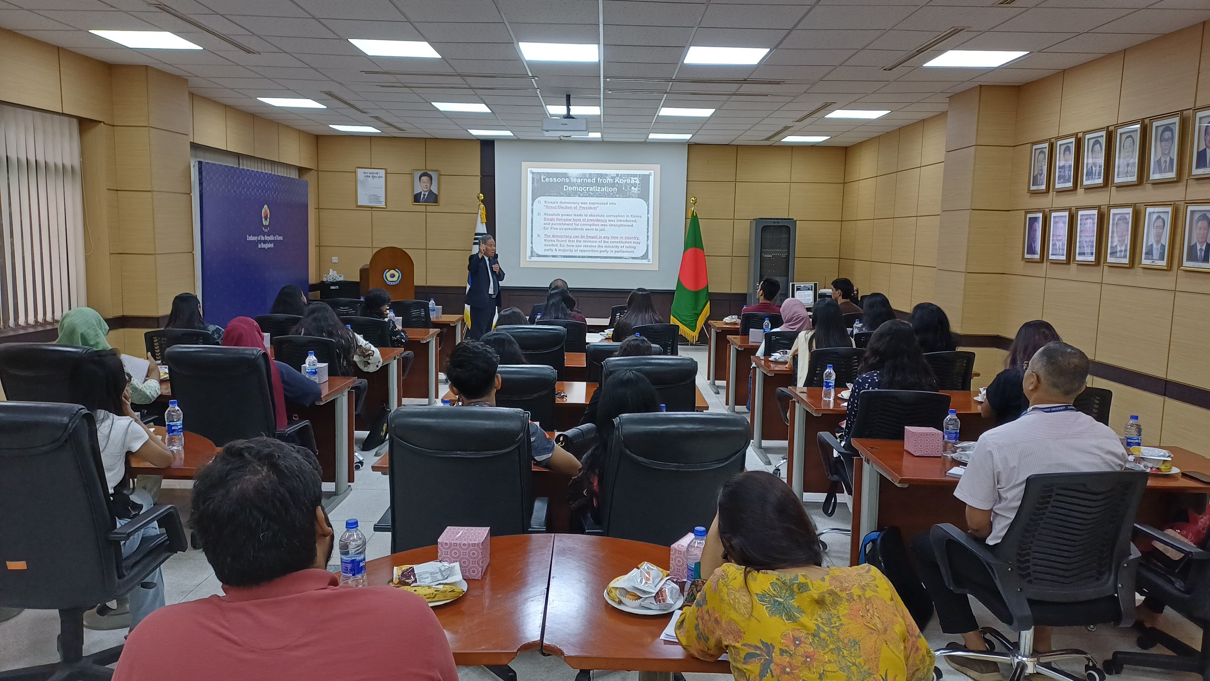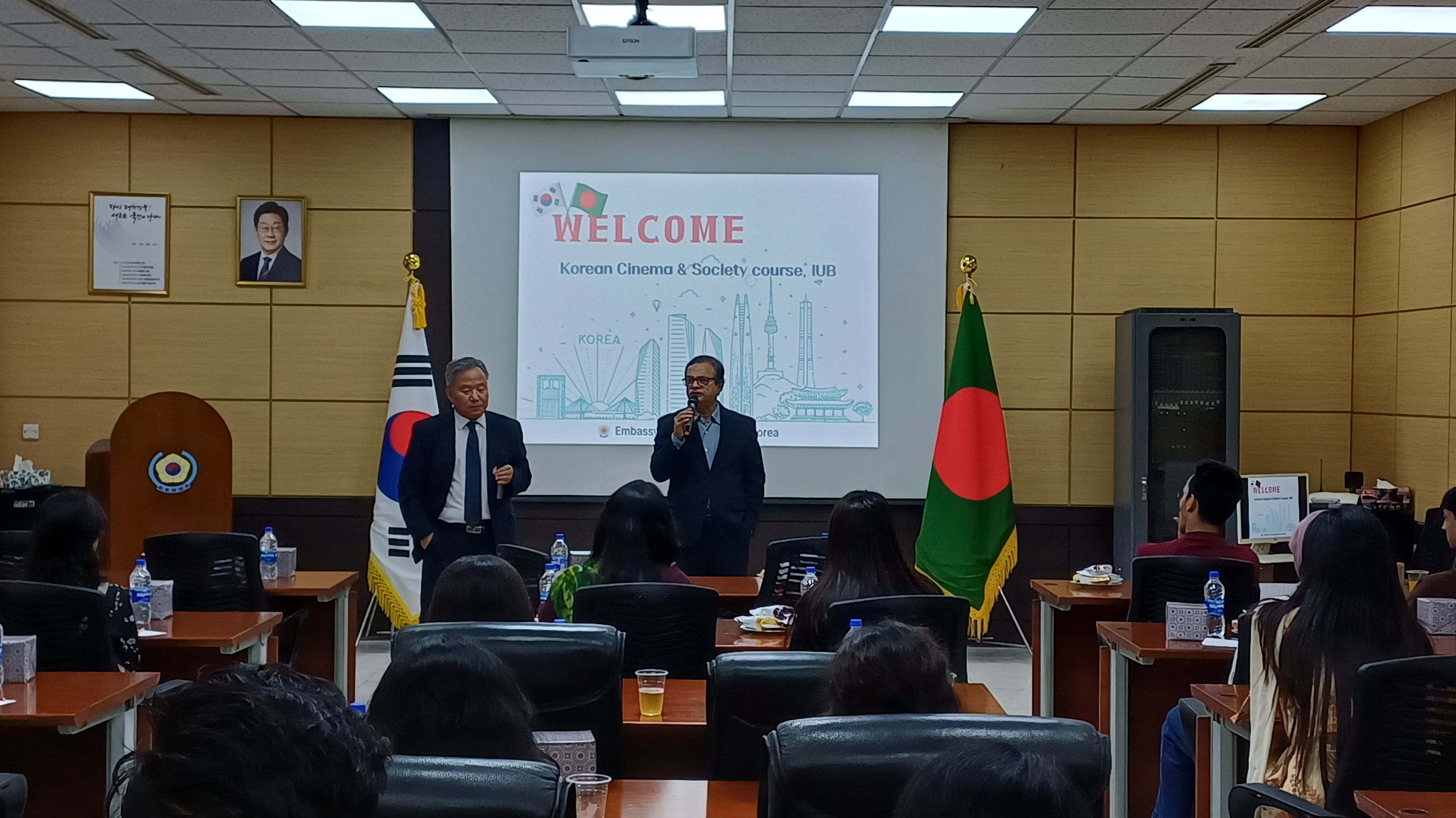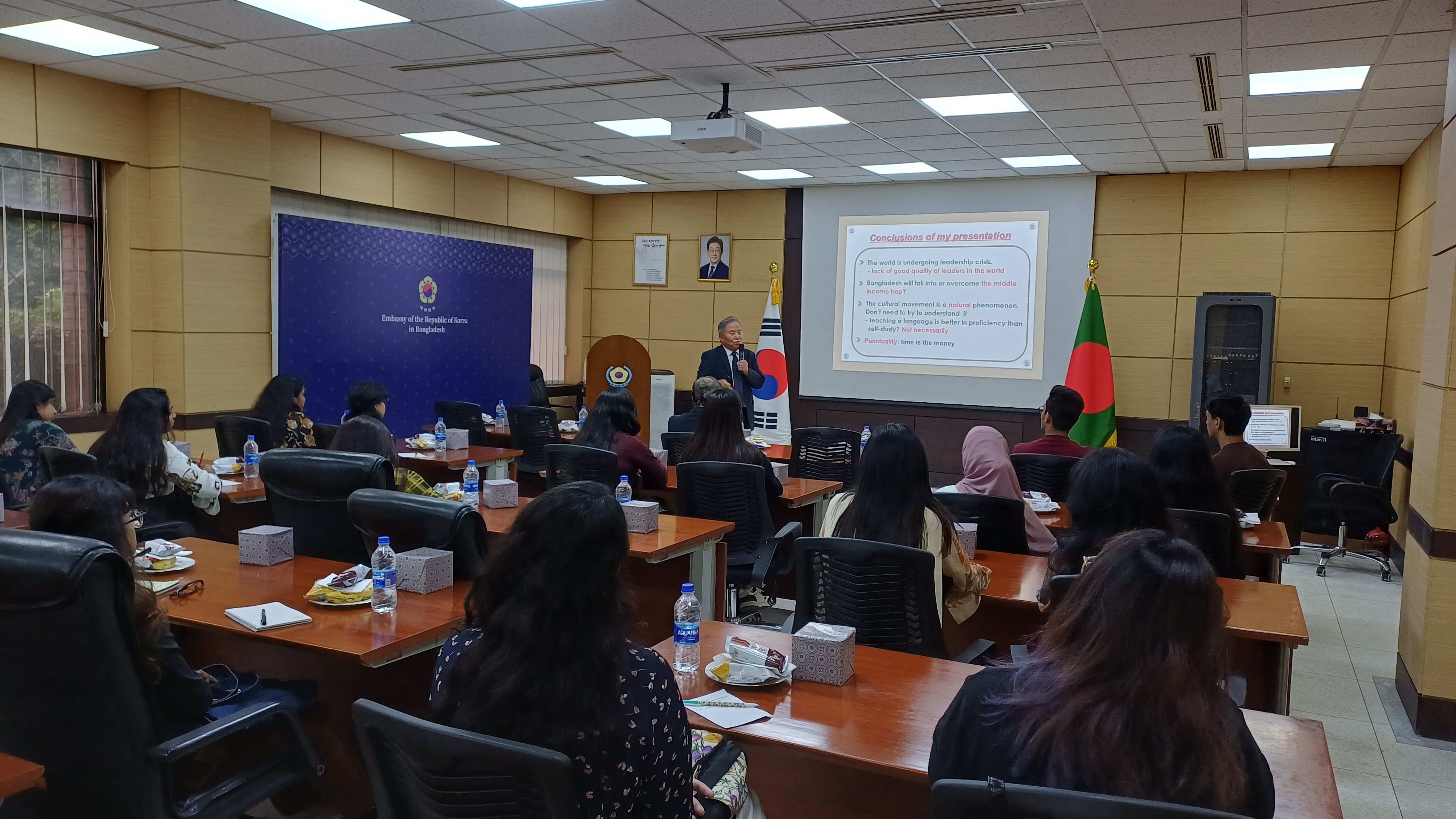 On 21 August, Amb.Park Young-sik met with members of the [Korean Cinema and Society course of IUB] who visited the Korean embassy and presented various contents about Korea. This presentation included a general introduction to Korea, Korea's Democracy and Economic growth, K-Culture and various Korean cultural events held by the Korean embassy this year.