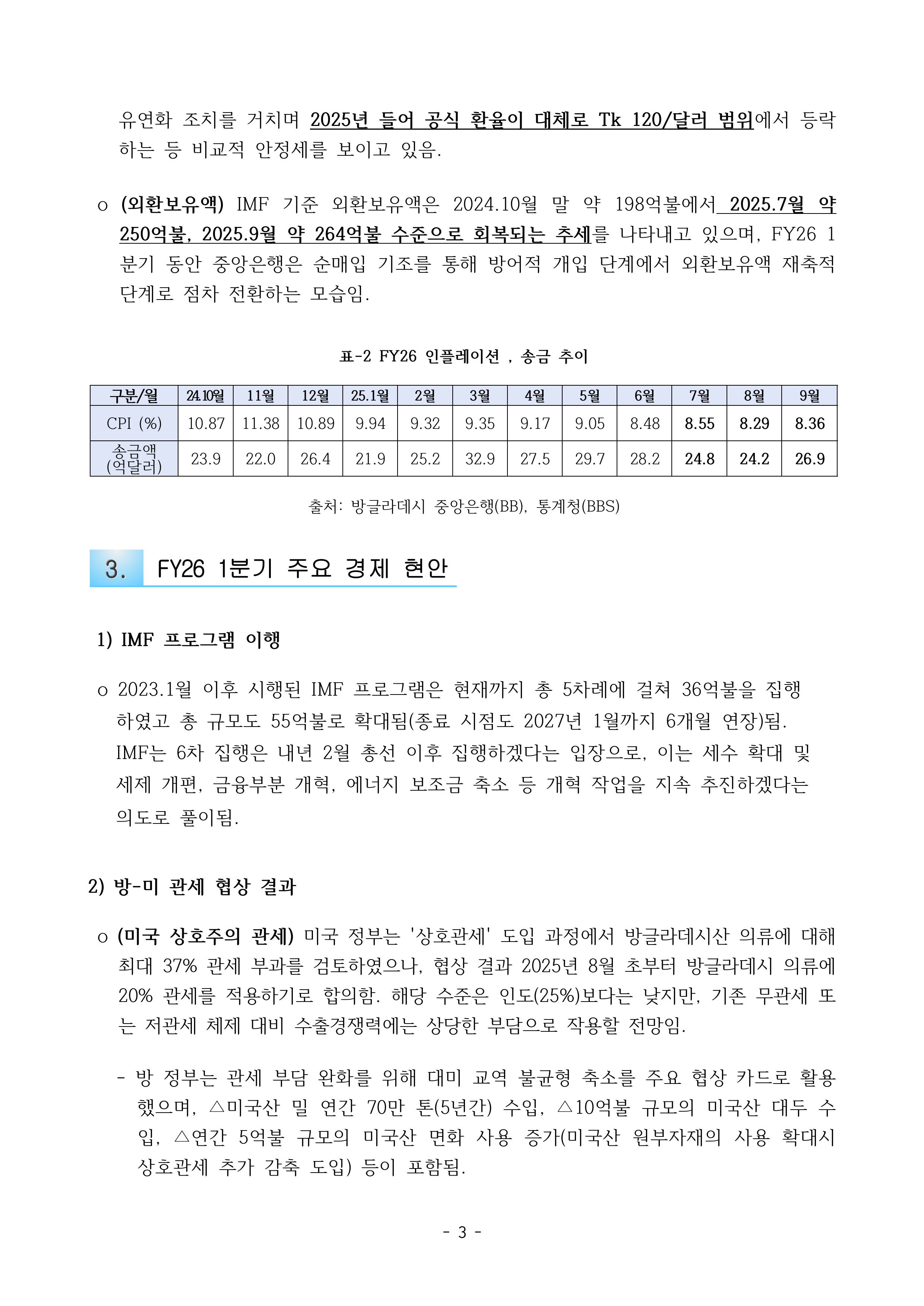 방글라데시 FY26 1분기(25.7-9월) 경제 동향