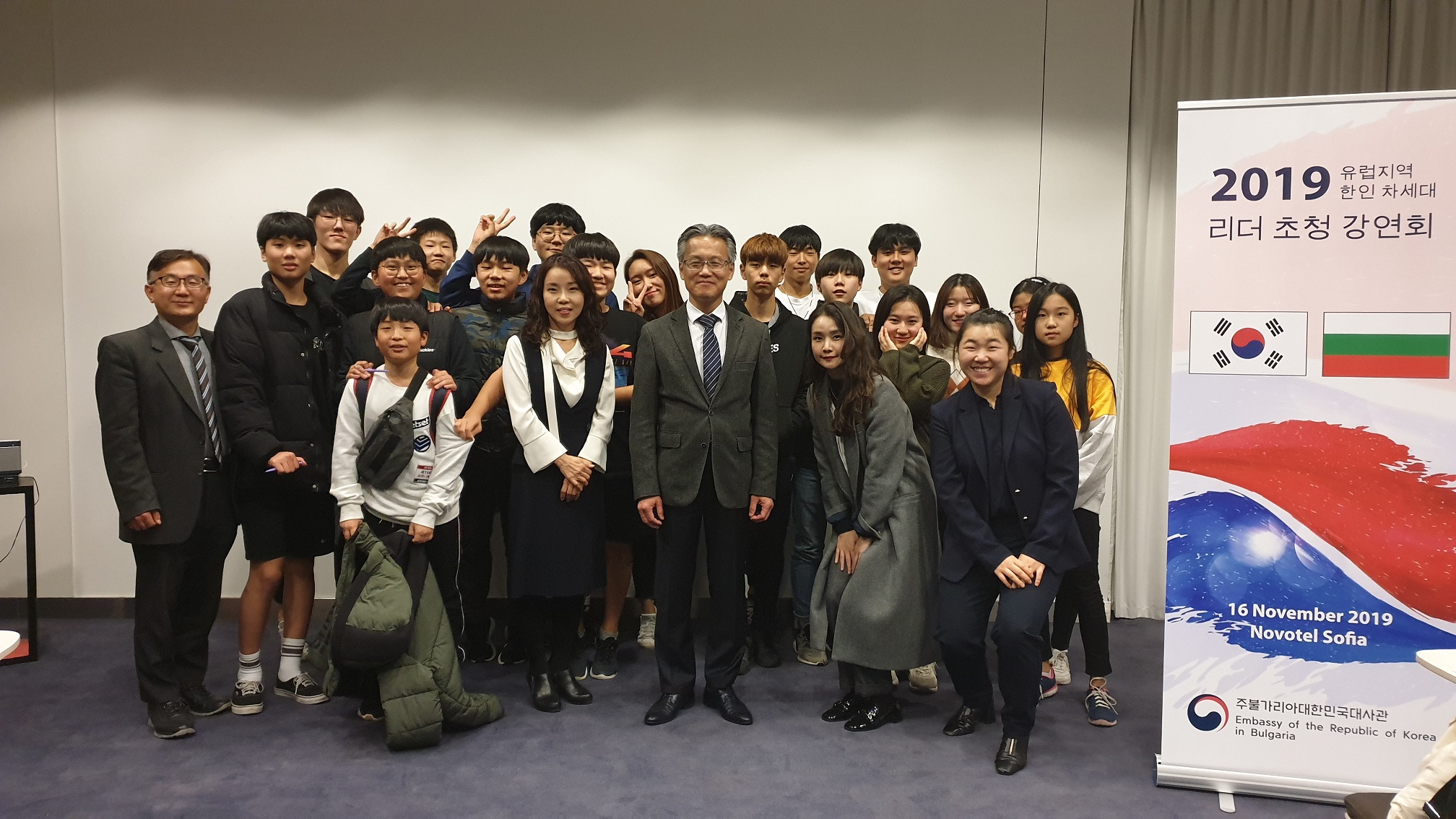주불가리아대사관은 2019.11.16.(토), 소피아 소재 노보텔에서 유럽 지역에서 활동 중인 한인 차세대 리더 및 관련 전문가들을 초빙하여 재외동포 2세들을 위한 강연회를 개최하였습니다. 동 강연회의 강사로는 △프랑스에서 변호사로 활동 중인 이단비 변호사, △불가리아 교육부에서 교육 프로그램 교류 등을 담당하고 있는 Polina Zlatarska, △국립소피아대학교에서 박사 과정 중에 있는 강캐시 학생, △국립소피아대학교 한국어과 김소영 교수 등이 약 20명의 우리 학생들에게 4차 산업혁명, 미래의 직업, 재외동포로서의 자긍심, 자기 계발 등에 관한 내용들을 설명하고 함께 토론하는 시간을 가졌습니다.