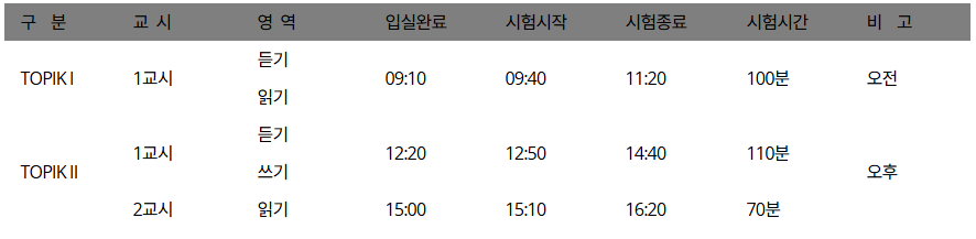- 시험 수준별(TOPIK Ⅰ, Ⅱ) 지원인원이 10명 미만인 경우 시험이 취소될 수 있음