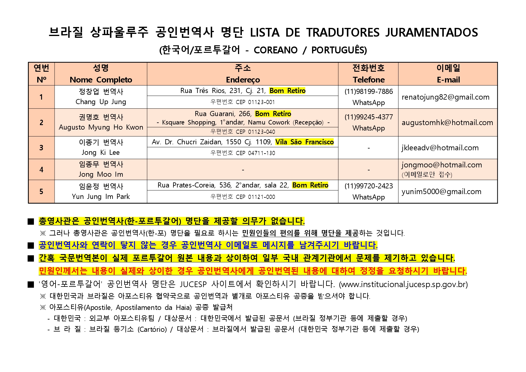 ▶ O Consulado da Coreia fornece a lista de tradutores juramentados (coreano-português) para a conveniência dos requerentes.