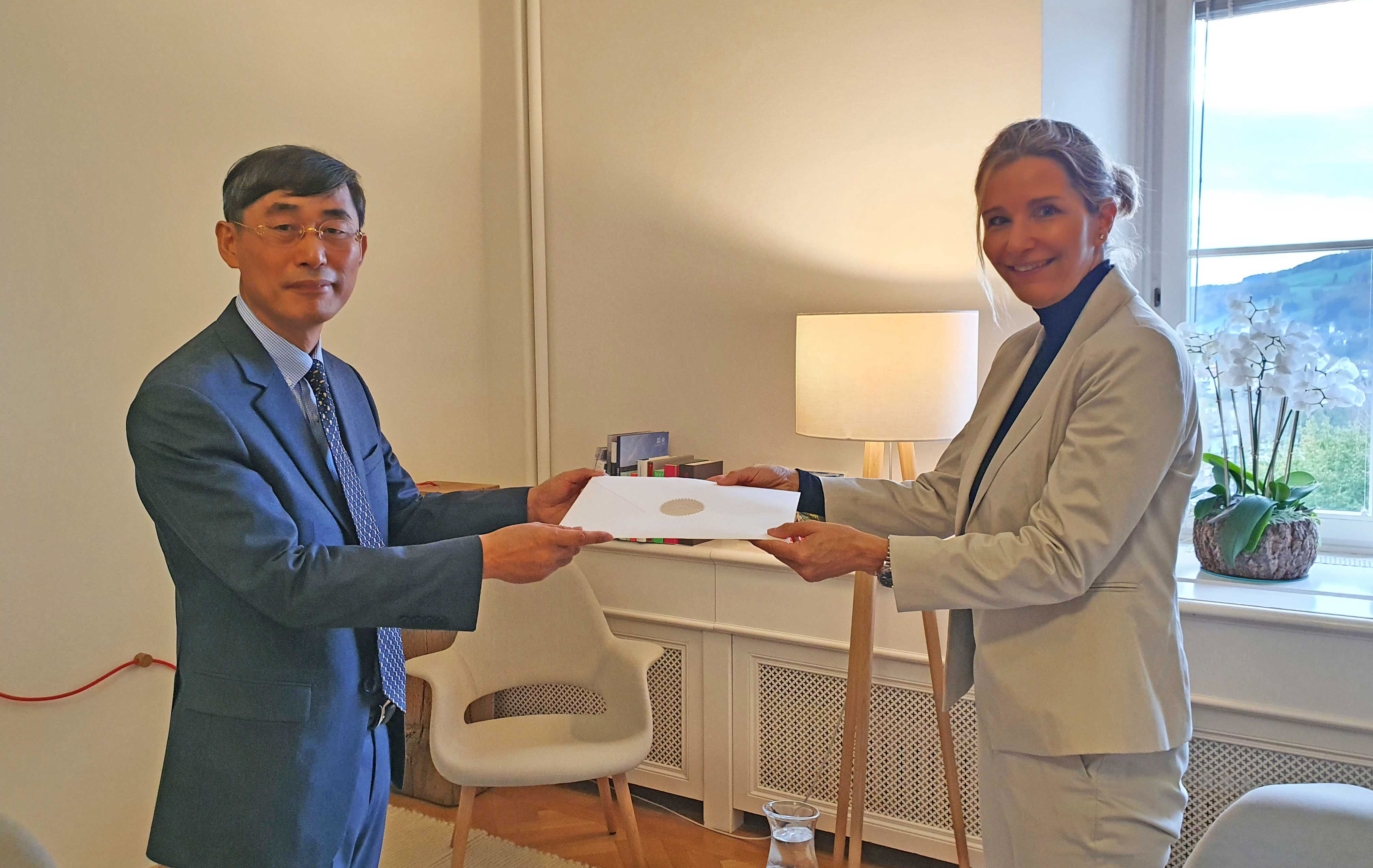 Ambassador-Designate Mr. Keum Chang-rok handed over copies of his credentials to the Head of the Protocol of the Federal Department of Foreign Affairs, Ambassador Ms. Beatrice Schaer on 28 October. Mr. Keum expressed his hope to strengthen mutual cooperation between the two countries in diverse sectors including high-level exchanges on the occasion of the 60th anniversary of the establishment of diplomatic relations in 2023.