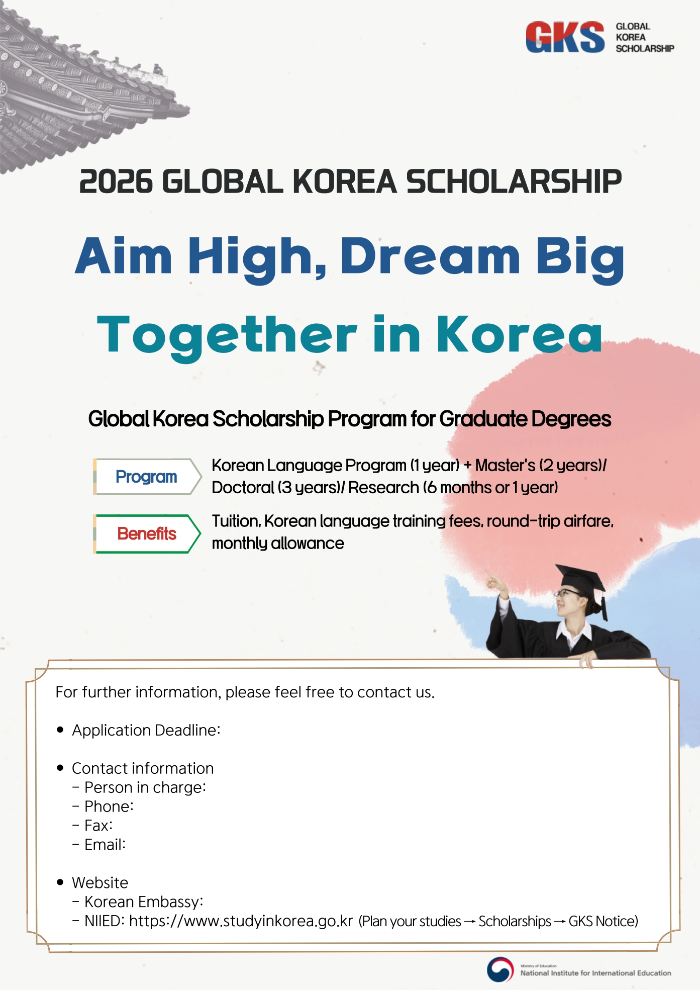 Please find enclosed information on 2026 Global Korea Scholarship (GKS) for Graduates, which is administered by the Korean National Institute for International Education (NIIED), Ministry of Education.