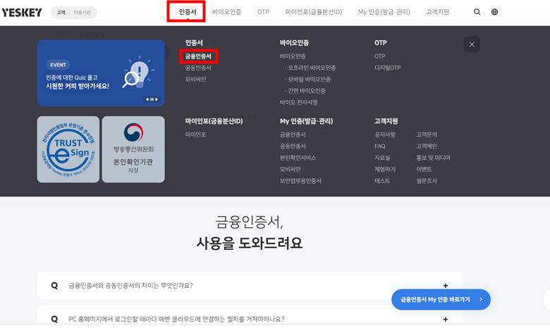 ※ 금융인증서 발급 방법은 상단 첨부파일 「금융인증서 발급가이드」및 홈페이지 안내(https://yeskey.or.kr/) 참고