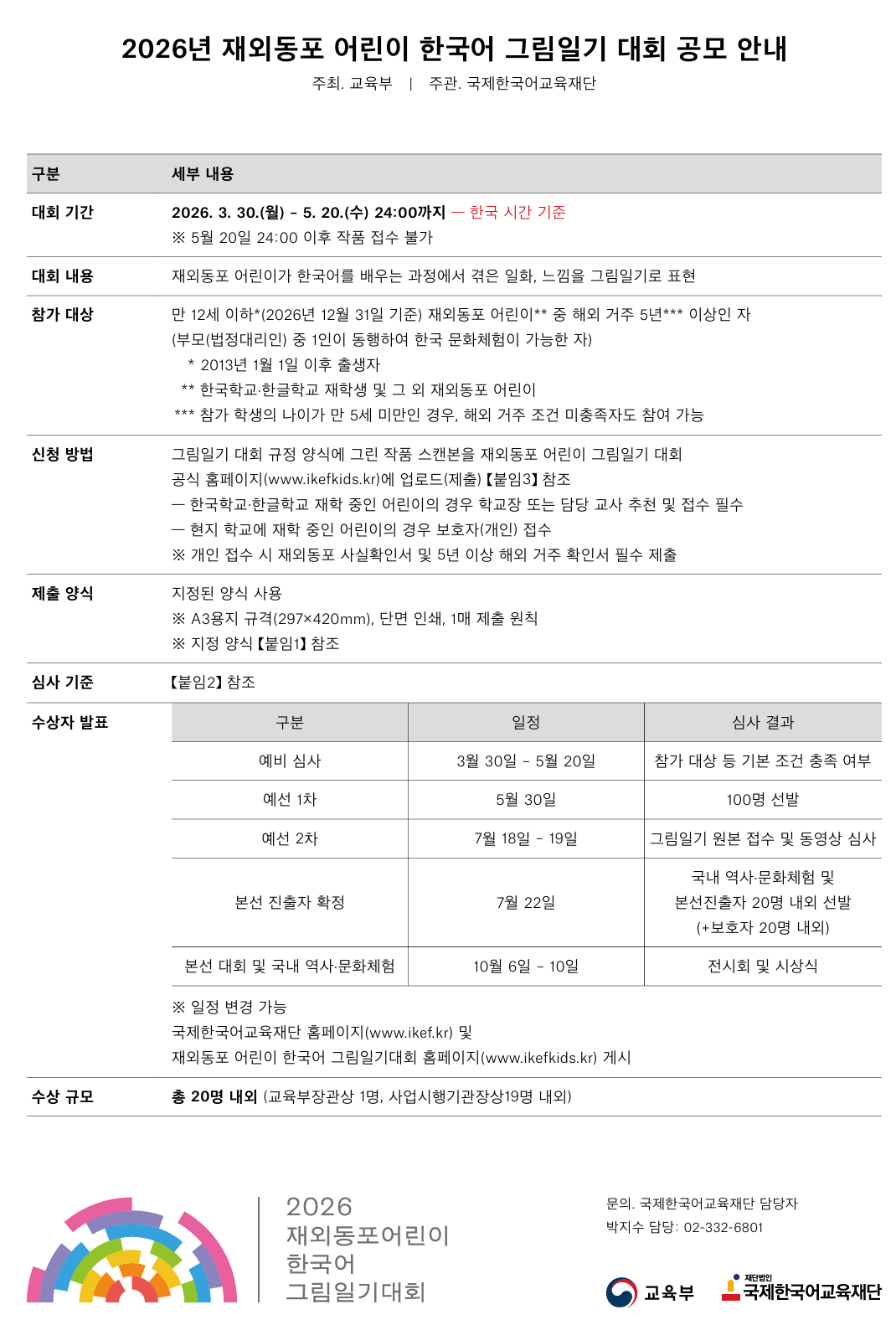 교육부와 국제한국어교육재단에서 2026년 재외동포 어린이 한국어 그림일기 대회를 개최하오니, 재외동포 여러분의 많은 관심과 참여를 부탁드립니다. (본선 진출자 20명과 보호자 20명은 한국 역사·문화 체험 프로그램 참여 가능)