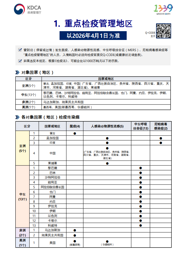 疾病管理厅规定,访问检疫管理地区及重点检疫管理地区(停留·过境)后入境韩国时,必须向检疫官提交Q-CODE(或健康状态问卷),截至2026年4月1日,中国全部或部分地区已列入为鼠疫和人感染动物源性流感和登革热检疫管理地区及重点检疫管理地区。
