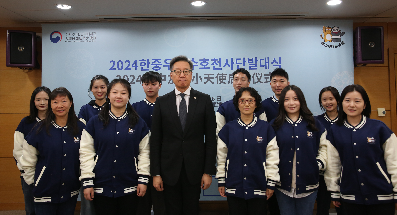 2024年韩中友好小天使启动仪式在韩国驻华大使馆举办,郑在浩大使向15位小天使团员颁发委任状并给予鼓励。
