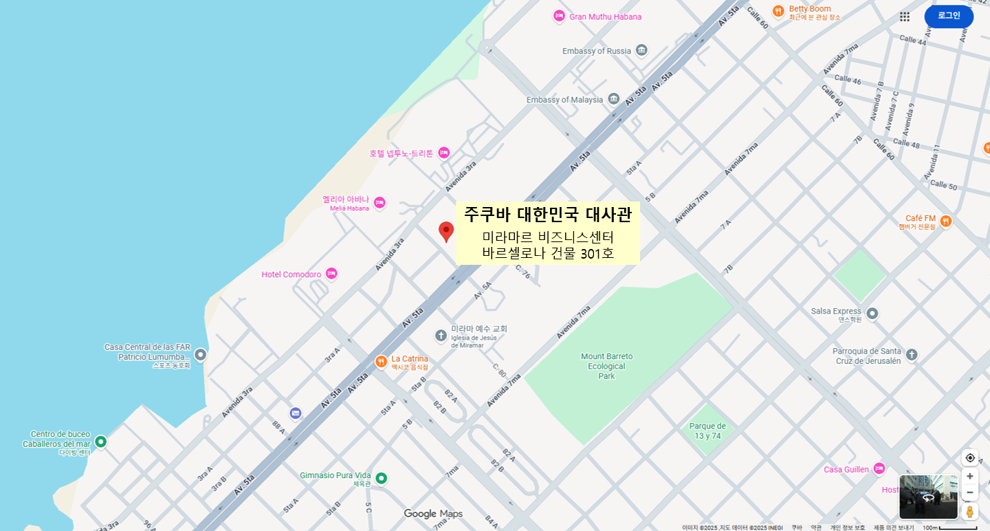 출입문은 5ta Avenida를 향해 있으며, 출입문에 태극기가 있습니다.