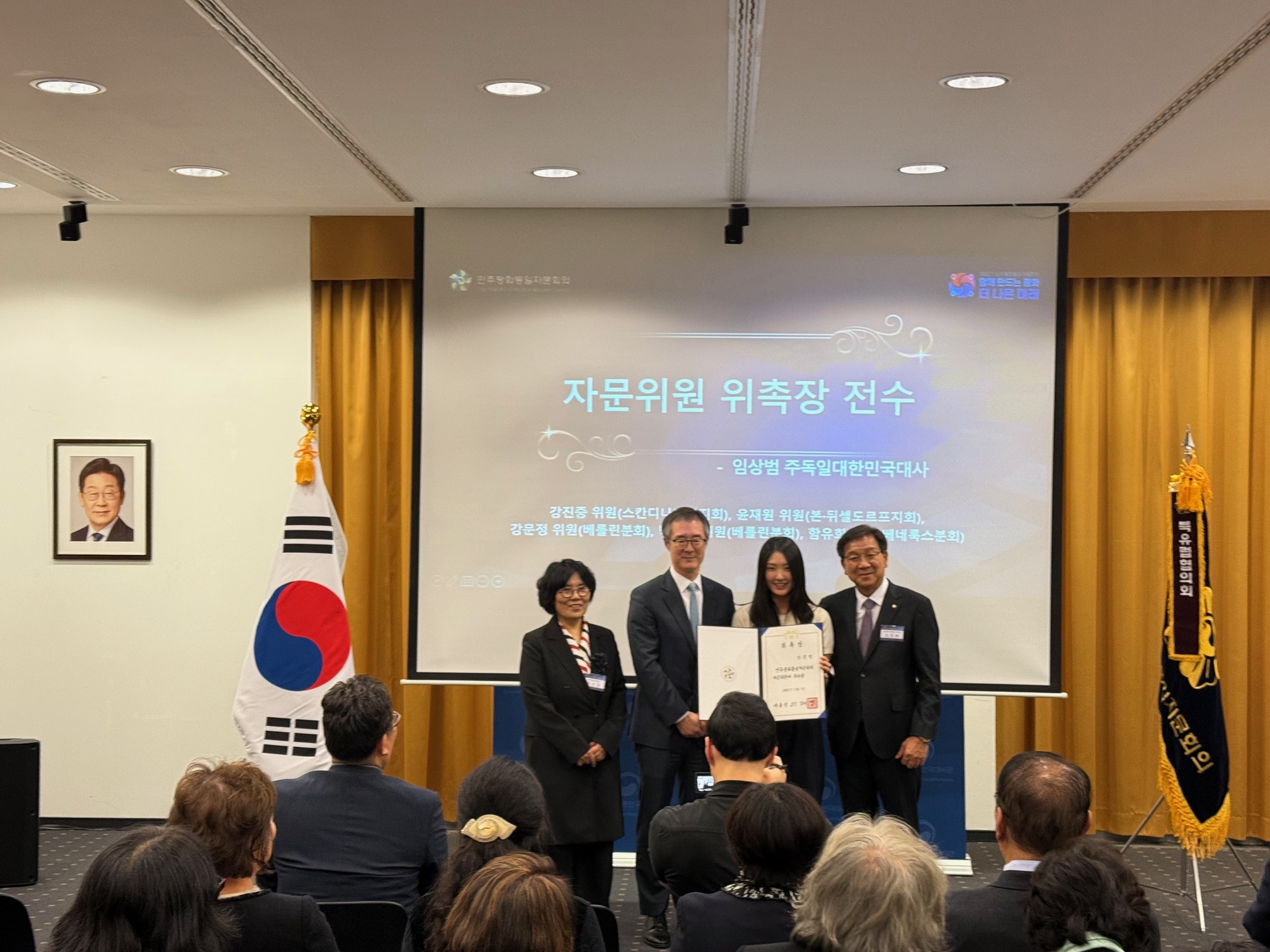 임상범 대사는 12.12.(금) 대사관에서 개최된 제22기 민주평통 북유럽협의회 출범식에 참석하여, 자문위원 대표에게 위촉장을 전수하고 자문위원들을 격려했습니다. 임 대사는 축사를 통해 민주평통 북유럽협의회가 한반도 평화를 위한 소중한 공론의 장이자, 동포 사회와 현지 사회를 잇는 신뢰의 네트워크로서 중요한 역할을 해줄 것을 당부했습니다. 이번 출범식에는 독일, 스웨덴, 노르웨이, 룩셈부르크 등 북유럽협의회(회장 정선경) 소속 민주평통 자문위원 70여 명이 참석했습니다.