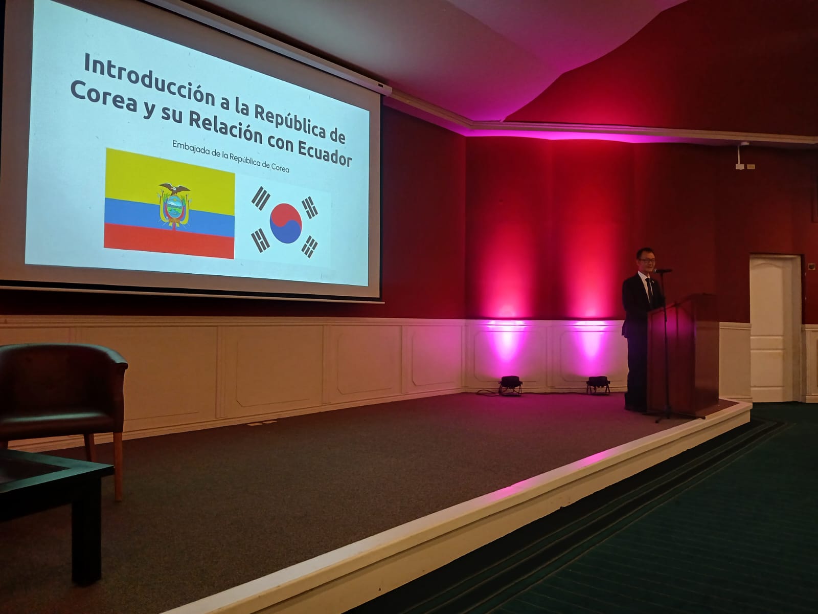 10.16.(수) 오후 심재현 대사는 '주재국 청소년에게 한국 알리기'라는 공공외교활동의 일환으로 키토에 소재한 에콰도르의 최고 명문 사립대인 샌프란시스코대학에서 국제관계학 전공인 150여명의 학생들을 대상으로 한국의 역사, 문화, 한강의 기적 경제성장 비결, 한반도 평화통일정책, 양국간 정치, 경제, 문화 협력현황, 한국의 외국인 장학생 제도(GKS) 등을 소개하였습니다.