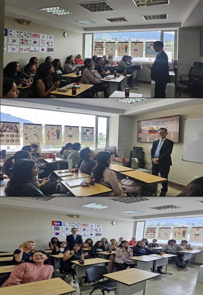 심재현 대사는 2026월 3월 25일 수요일 오전 키토에 소재한 에콰도르 중앙대학교 키토세종학당에서 최종 8단계를 이수하여 금년 4월 15일 졸업예정인 수강생 8명 등 고급반 학생 20여 명을 대상으로 한국어 이해제고를 위한 강연을 실시하고 학생들의 장래진로 등에 대해서도 환담하였습니다.