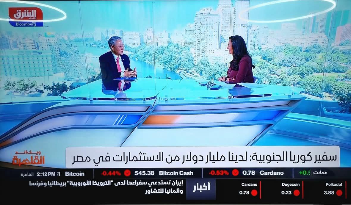 김용현 대사는 9.27.(토) 이집트 아랍어 경제뉴스 채널인 Asharq Business with Bloomberg 코너에 출연하여 생방송 인터뷰를 가지고, 한-이집트 투자, 통상협력 현황 및 우리 기업의 이집트 진출 현황을 소개하고, 수교 30주년을 맞이하여 양국간 경제협력 발전 방안을 설명하였습니다.