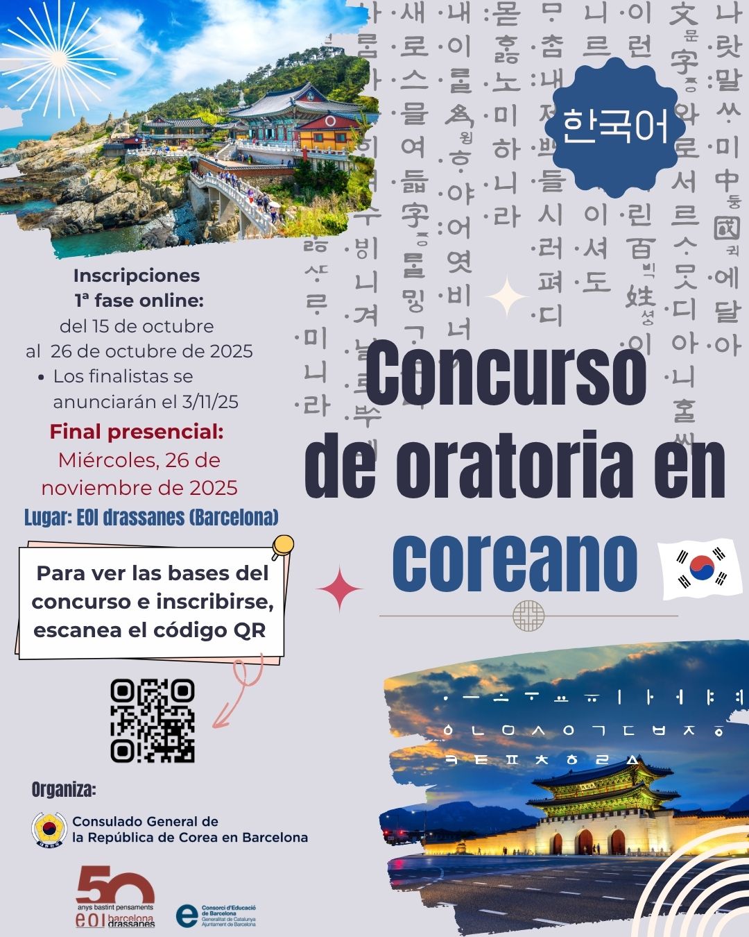 Con motivo de la celebración del 75 aniversario del establecimiento de las relaciones diplomáticas entre España y la República de Corea, el Consulado General de Corea en Barcelona organiza con la Escuela Oficial de Idiomas(EOI) el Concurso de Oratoria en Coreano, dirigido a todas aquellas personas que estudian coreano en Cataluña, ya sea en la EOI, en otros centros educativos o de forma autodidacta.