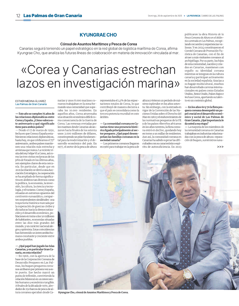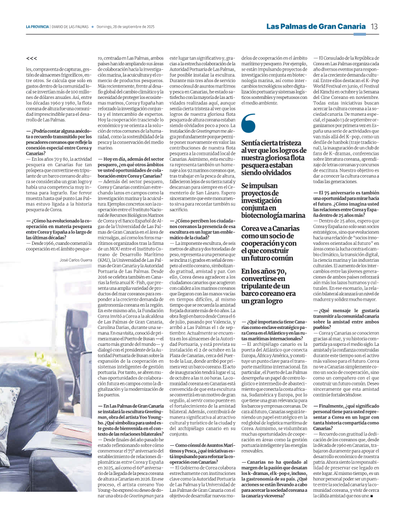 조경래 해양수산관은 지난 9.23(화) 주재지 주요 일간지인 La Provincia와 그리팅맨 제막식 관련 인터뷰를 실시하였으며, 동 내용이 9.28(일) 2면 인터뷰 기사로 아래 내용과 같이 보도되었습니다.