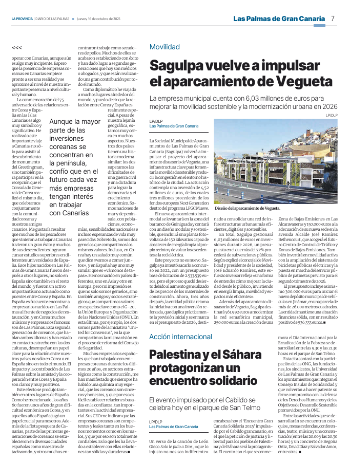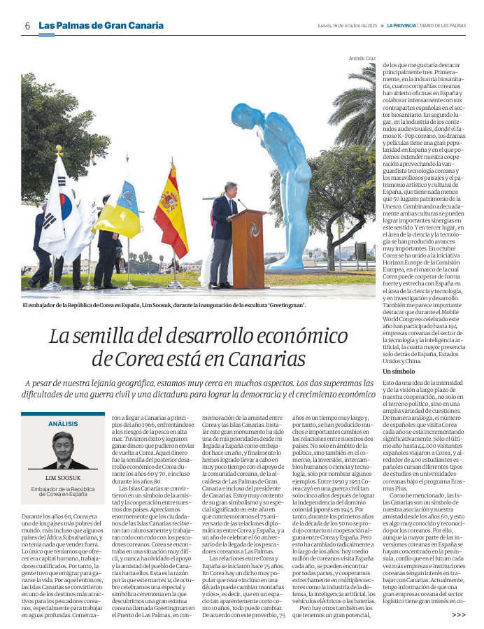 10.16.(목) La Provincia 일간지는 그리팅맨 제막식 계기 임수석 주스페인대사의 축사 사진과 함께 “한국경제발전의 씨앗은 카나리아에서(La semilla del desarrollo economico de Corea esta en Canarias)” 란 기사를 2페이지에 걸쳐 크게 보도하였습니다.