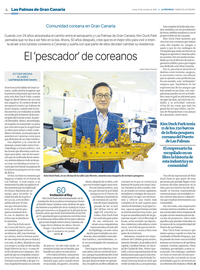 지난 10.11.(일) 주재지 주요 일간지인 La Provincia는 그리팅맨 제막식 관련, 라스팔마스 교민대표(박덕, 전 서경수산 대표)와의 인터뷰 기사를 보도하였습니다.