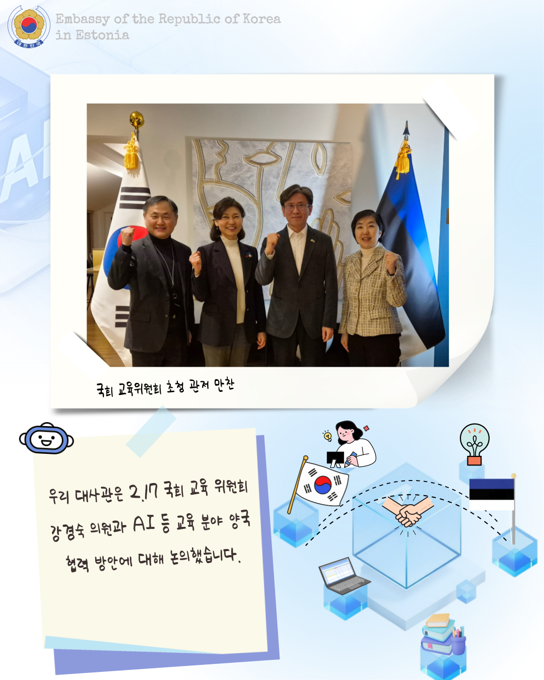 우리 대사관은 2.17 국회 교육 위원회 강경숙 의원과 AI 등 교육 분야 양국 협력 방안에 대해 논의했습니다.