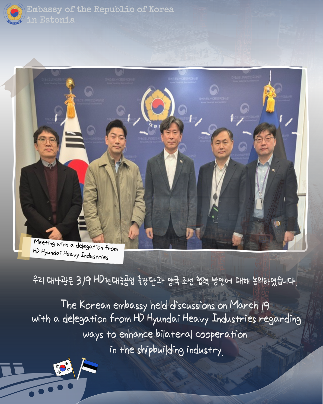 우리 대사관은 3.19 HD현대중공업 출장단과 양국 조선 협력 방안에 대해 논의하였습니다.