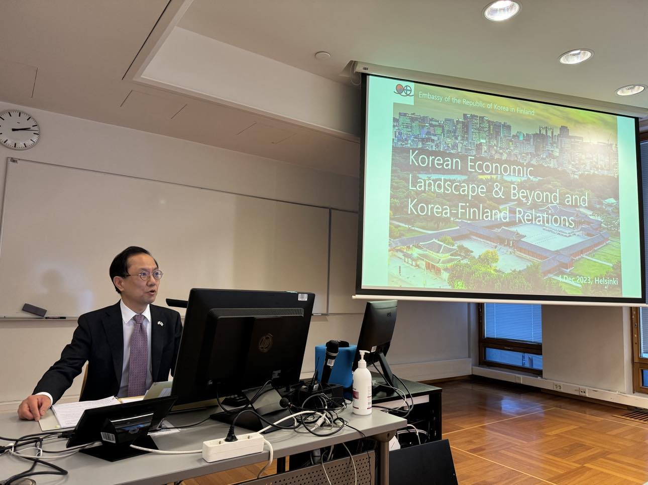Ambassador KIM, Jung-ha gave a lecture on economic status of Korea and Korea-Finland relationships for teaching staff and students at Helsinki University on December 4th.