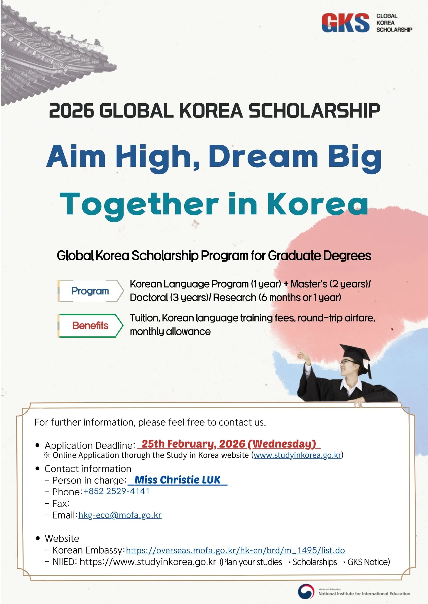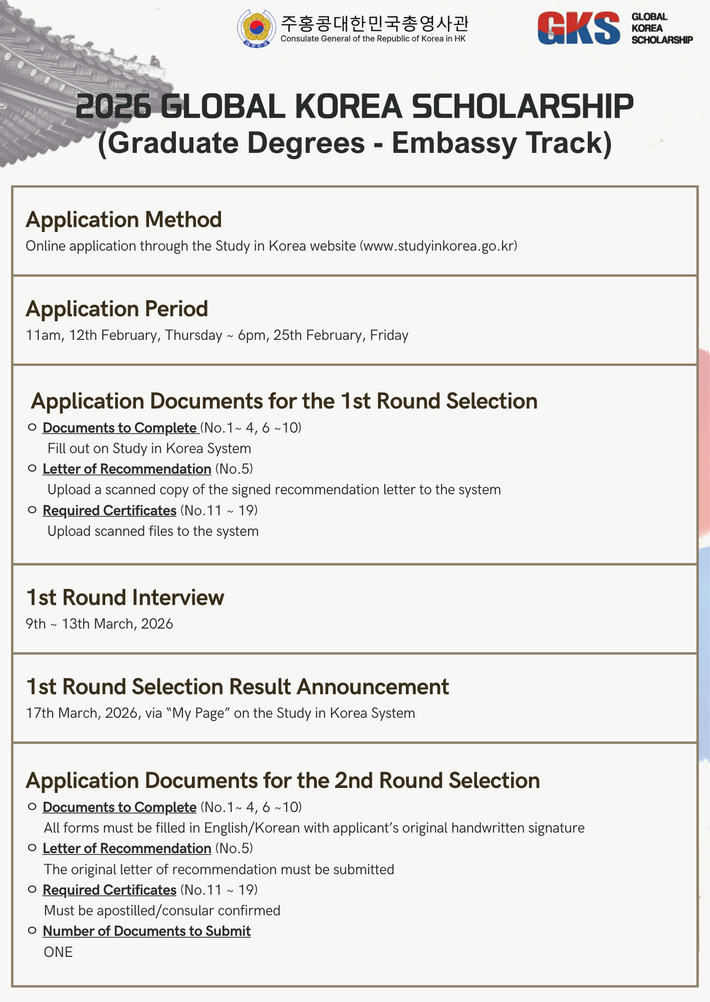 Further information about the 2026 Graduate GKS is available at the websites http://www.niied.go.kr/eng/main.do or https://www.studyinkorea.go.kr/ko/plan/scholarship.do