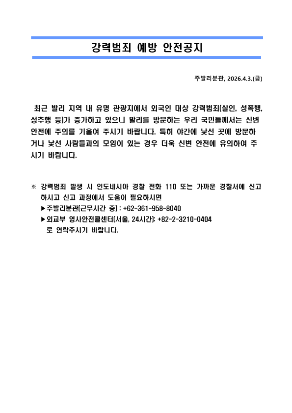녜삐데이(Nyepi Day) 전후 차량 이동 관련 유의사항 안내