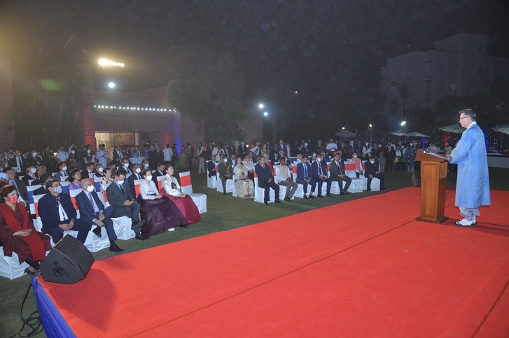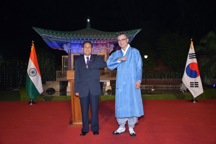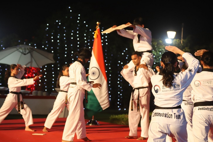 Due to the Covid 19 pandemic, the Embassy held a smaller gathering than usual, with 170 members of the Indian government & foreign missions, Korean residents, Indo Korea Friendship Society, etc. in attendance. The reception began with an instrumental performance by musicians playing the sitar, bansuri and srangi, followed by a K-Pop dance by the Lokalz Crew winning team of the 2019 K-Pop contest. The Korean Cultural Center's Taekwondo demonstration team concluded with a Poomsae and tile-breaking demonstration and an Arirang performance.