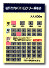 후쿠오카에서 하카타 역이나 텐진 중심가 외에 시사이드 모모치 해변(후쿠오카 돔, 호크스 타운, 마리존, 후쿠오카 타워 등이 모여있는 지역)이나 베이사이드 플레이스(하카다 항 주변) 지역을 하루 동안 모두 둘러보고자 할 경우에는 '니시테츠 버스 1일 프리 승차권'을 구입하는 것이 경제적입니다. 일반적으로 각 도시의 1일 승차권은 대부분 공전전화카드처럼 생긴 카드식인데 반해, 후쿠오카의 1일 프리 승차권은 생김새가 특이한데, 승차권을 구입한 후 해당 연월일을 동전으로 긁어서 자신이 사용할 날짜를 표시해야 합니다