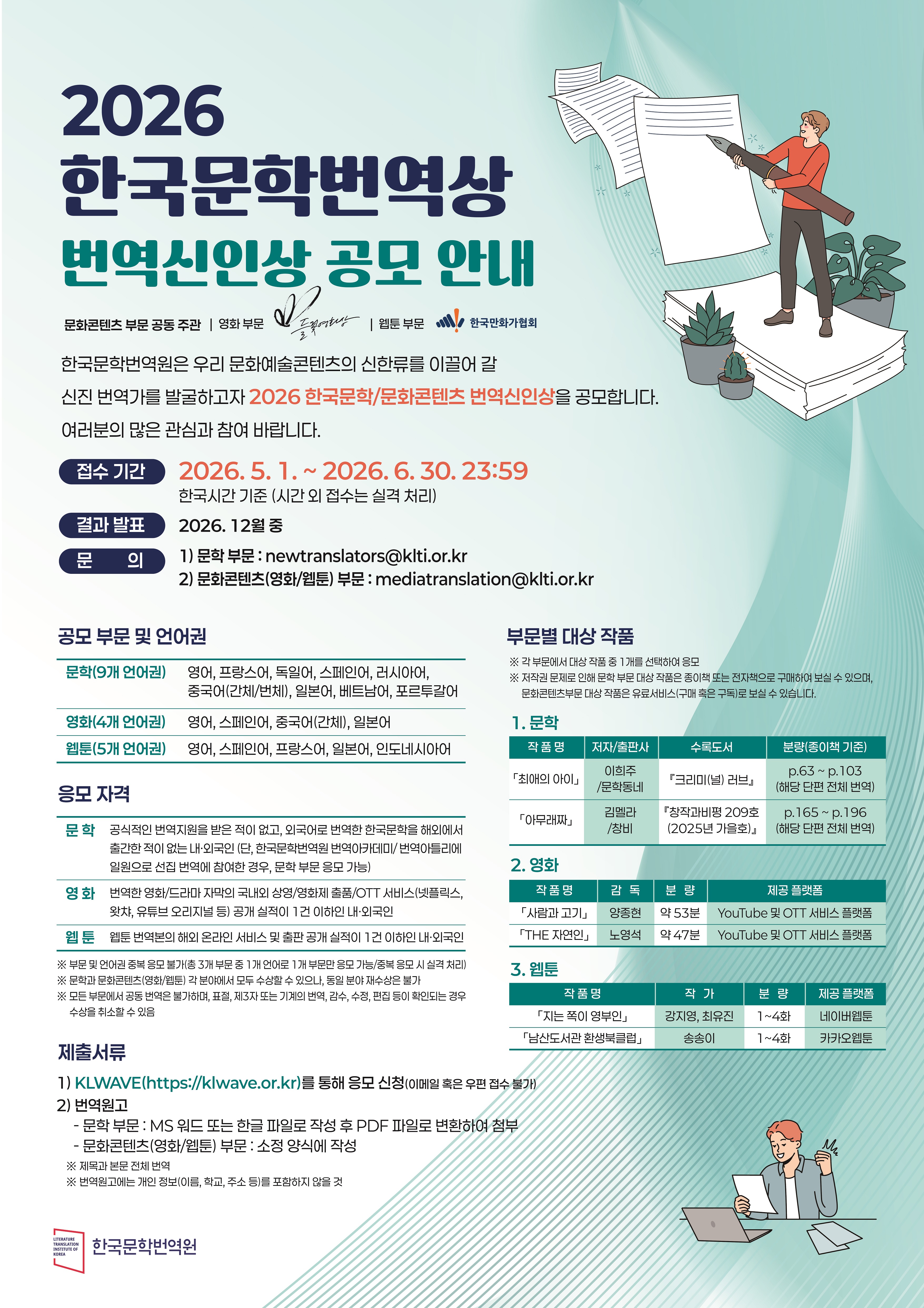 [한국문학번역원] 「2026 한국문학/문화콘텐츠 번역신인상」 공모 안내