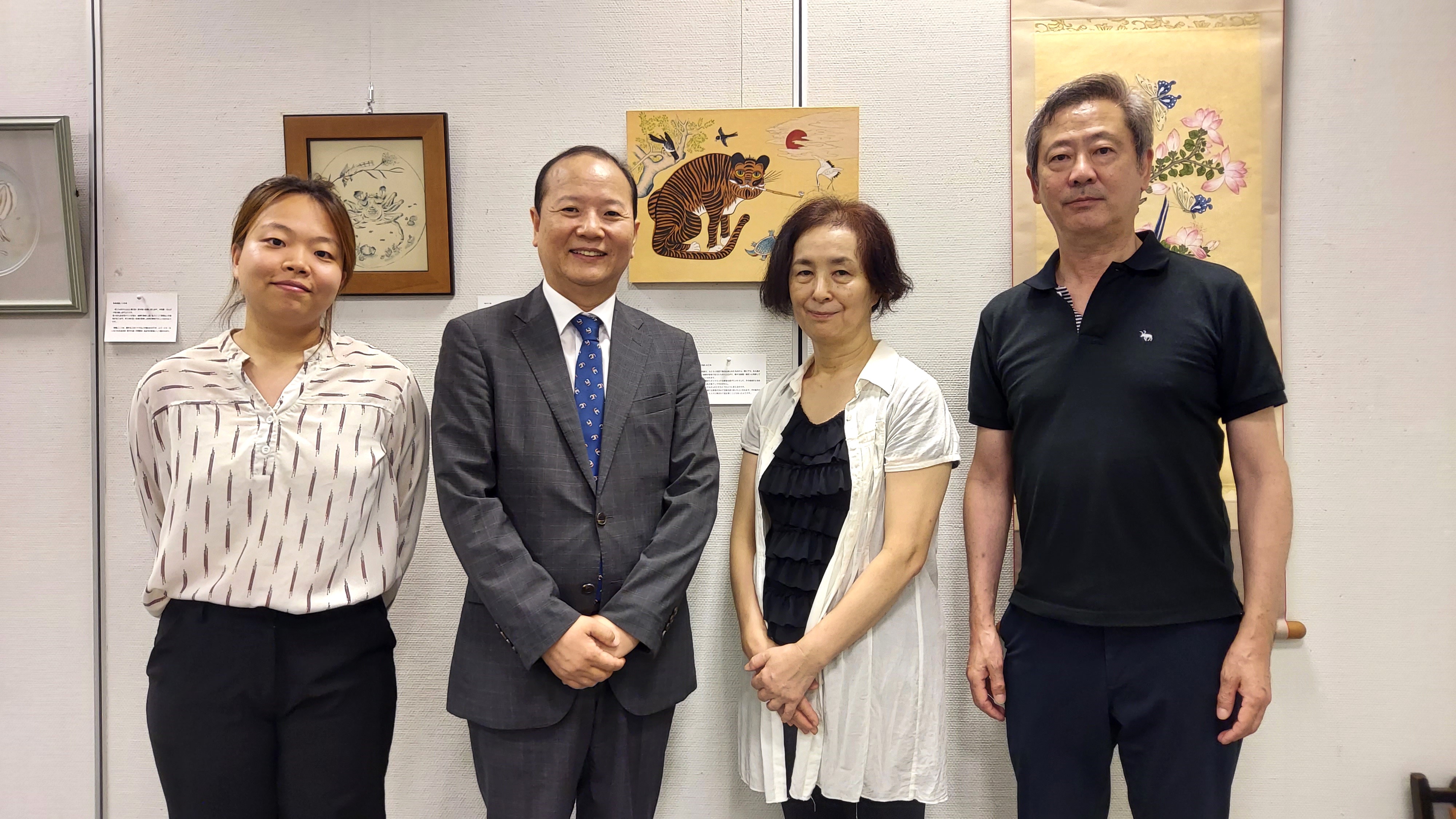 呉榮煥総領事は10月1日、新潟県民会館で開かれている石原奈穂子(右から2番目)作家の「韓国での日々 民画と丹青」展を訪れ、韓国の伝統絵画を日本に紹介していることへの感謝を伝えました。
