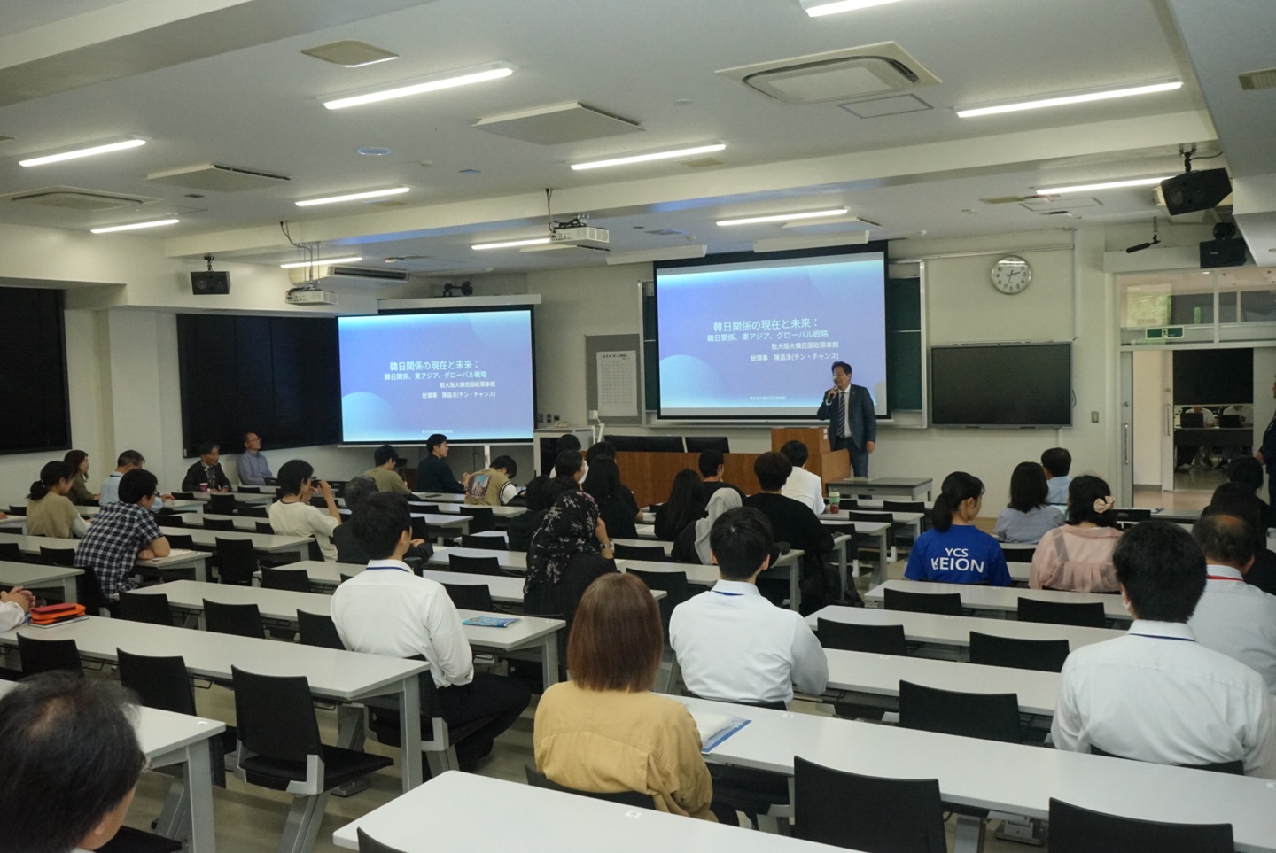 学長との懇談に続いて総領事は、滋賀大学の講義室で学生と教職員を対象に、「︎韓日関係の現在と未来」︎という題で特別講演を行ないました。 今回の特別講演は、韓日関係の現状や韓日両国の協力方案などについて語られました。講演後、韓日の未来世代への提言など、さまざまな質疑応答がありました。