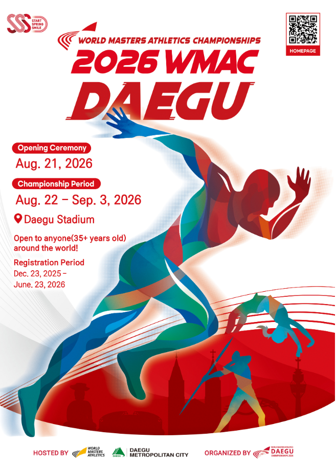 2026 대구세계마스터즈 육상경기대회를 2026.8.22(금) ~ 9.3(토) 13일간 개최하니 많은 관심 바랍니다.