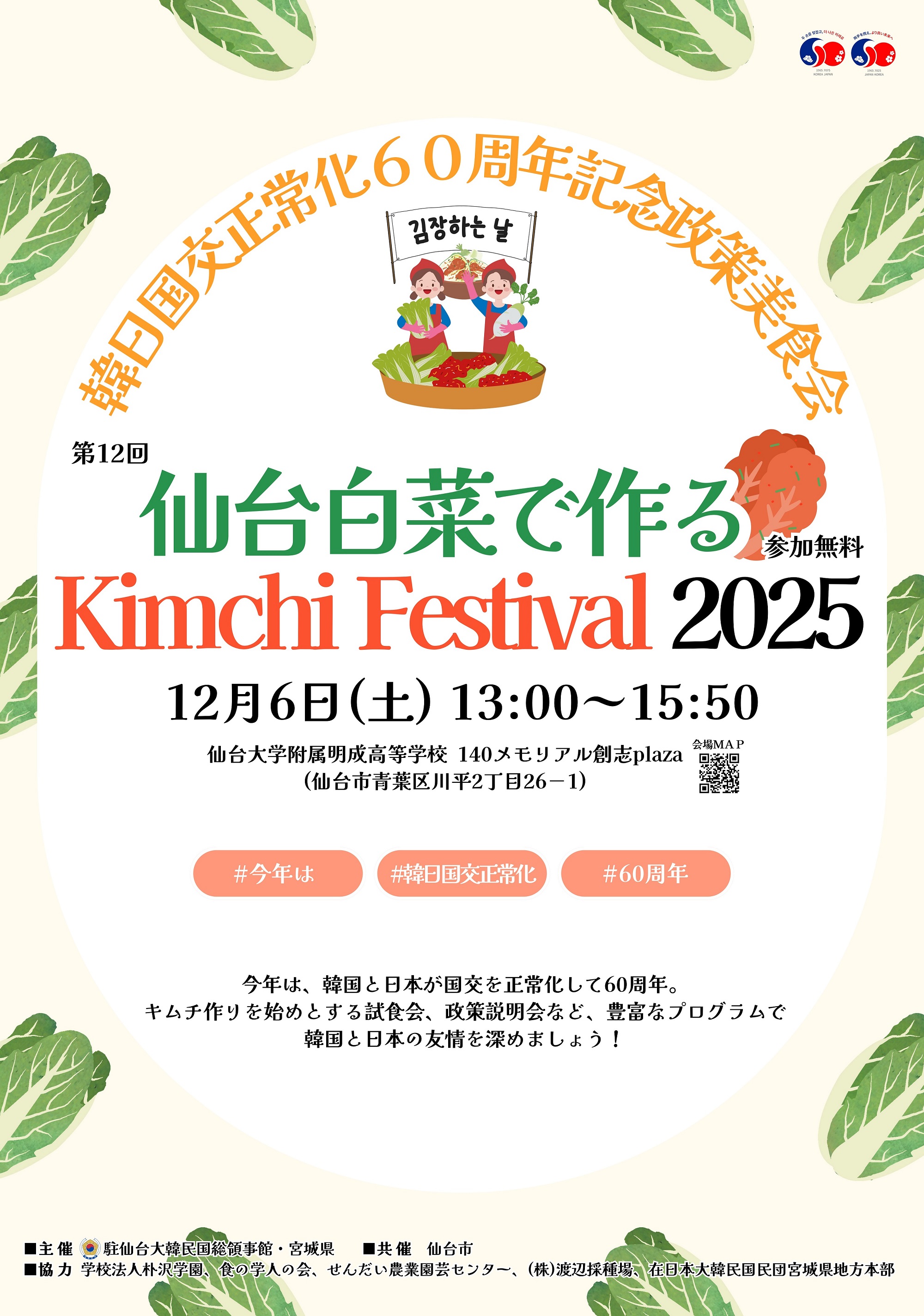 駐仙台大韓民国総領事館は、第12回『仙台白菜で作る Kimchi Festival 2025』を下記のとおり開催します。