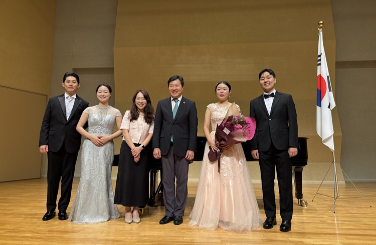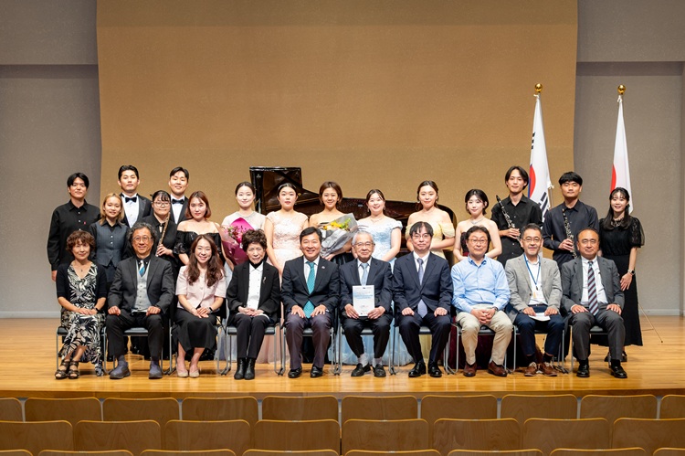 南相圭副総領事は9月18日、神奈川県川崎市の昭和音楽大学「ユリホール」で開催された「ソウル市立大学 × 昭和音楽大学 韓日大学交流コンサート」を鑑賞し、素晴らしい演奏を披露した両国の学生に花束を贈り、激励しました。