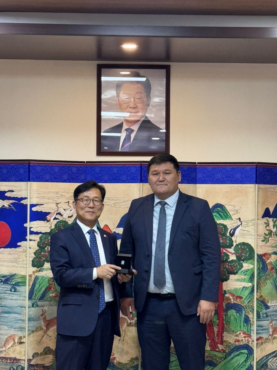 10.10(금) 김광재 대사는 비슈케크 시의회 즐드스벡 아브드라이모프 부의장을 면담하고, 도시 및 양국 간 우호 협력 관계의 지속적 발전 방안과 교류 확대 가능성에 대한 의견을 교환하였습니다. 이 자리에서 즐드스벡 부의장은 지난 국경일 리셉션을 다시한번 축하하고 김대사의 양국 관계 발전에 기여한 역동적인 역할을 높이 평가하며, 감사의 뜻으로 비슈케크 시의회 뱃지를 전달하였습니다.