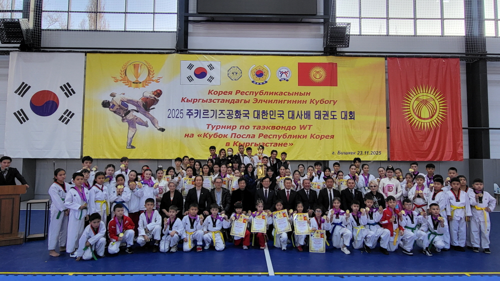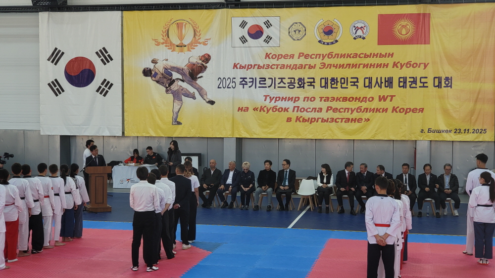 2025.11.23.(일) 우리 대사관은 ‘알가’ 스포츠센터에서 '제11회 대한민국 대사배 태권도 대회'를 개최하였습니다. 동 대회에는 키르기즈공화국 태권도협회 회장 및 사무총장, 상공회의소 대표, 고려인협회 회장대행 외 전국의 태권도 선수와 카자흐스탄 시범단 및 관객 등 250여 명이 참석하였습니다.