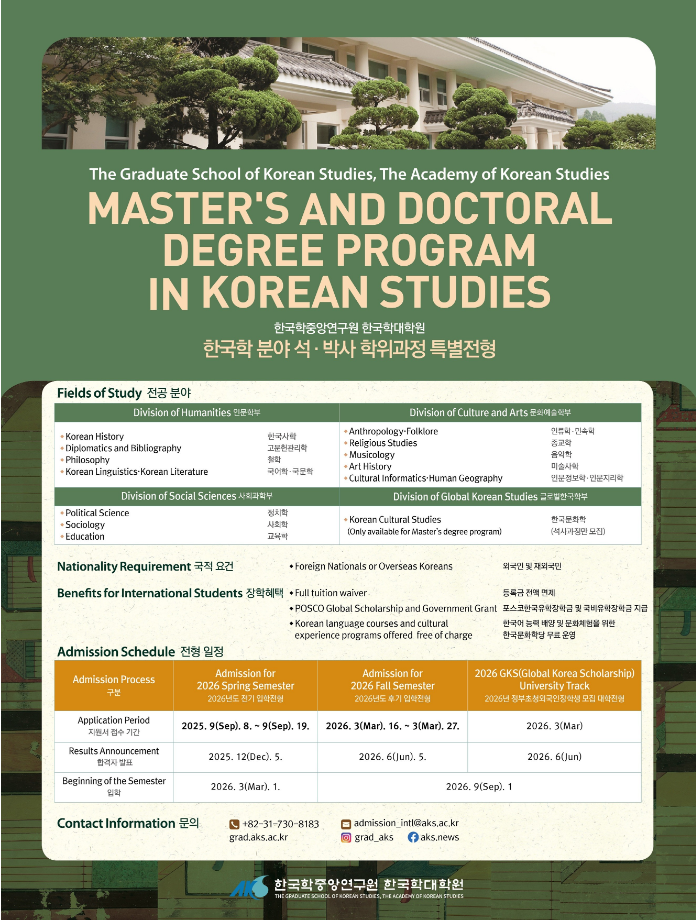 The Graduate School of Korean Studies at the Academy of Korean Studies (AKS) is now accepting applications for the 2026 spring special admission program. We encourage individuals with an interest in Korean studies to apply.