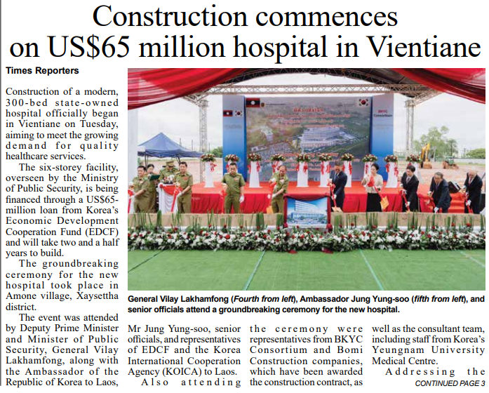 ㅇ Laos has started construction on a modern 300-bed state-owned hospital in Vientiane to meet growing demand for quality healthcare. The project, funded by a US$65 million loan from Korea’s EDCF, will take 2.5 years to complete and represents one of the largest healthcare infrastructure investments in recent years.