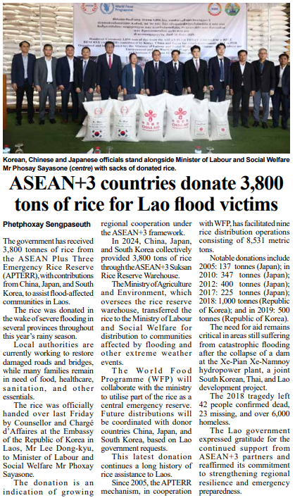 ㅇThe Lao government received 3,800 tonnes of rice from the ASEAN Plus Three Emergency Rice Reserve (APTERR), with contributions from China, Japan, and South Korea, to support flood-affected communities. The rice was officially handed over by Mr. Lee Dong-kyu, Chargé d’Affaires at the Embassy of the Republic of Korea in Laos, to Minister of Labour and Social Welfare Phoxay Sayasone. Authorities continue to restore damaged infrastructure while many families remain in need of food and other essentials.