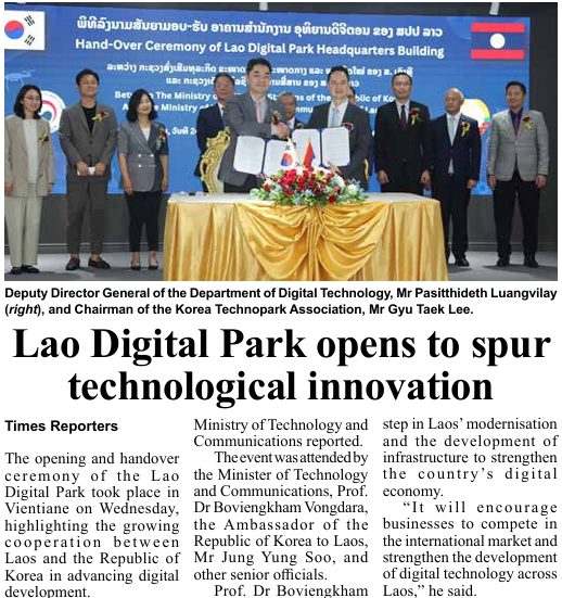 ㅇThe opening and handover ceremony of the Lao Digital Park was held in Vientiane on Wednesday, marking a milestone in digital cooperation between Laos and the Republic of Korea. The event was led by Deputy Director General of the Department of Digital Technology, Mr. Pasitthideth Luangvilay, and Chairman of the Korea Technopark Association, Mr. Gyu Taek Lee, with the participation of Minister of Technology and Communications, Prof. Dr. Boviengkham Vongdara, and Ambassador of the Republic of Korea to Laos, Mr. Jung Yung Soo.