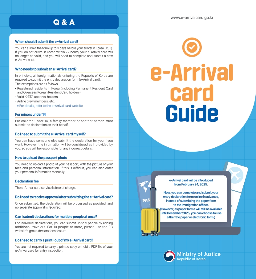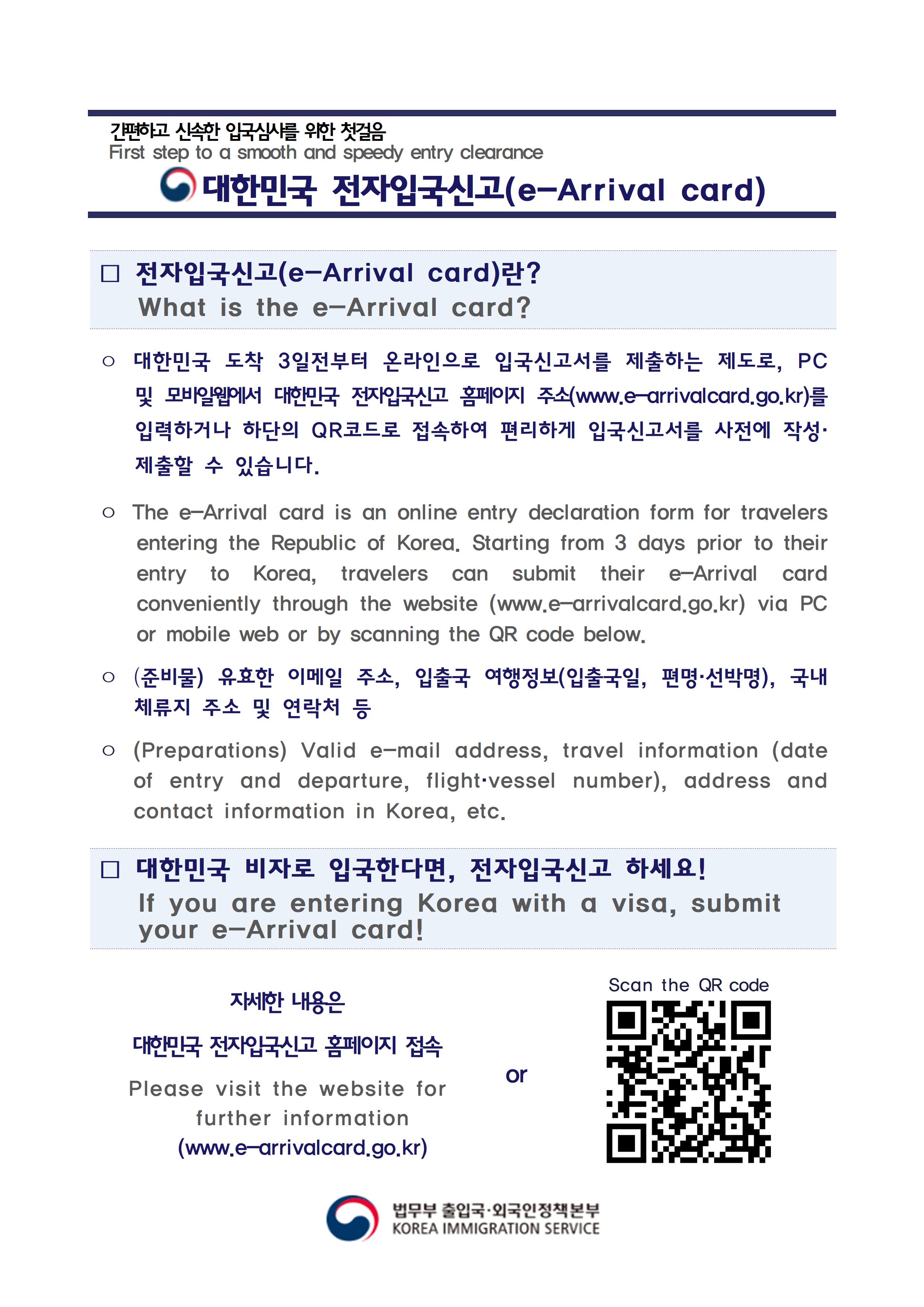 Starting from 24th of February, 2025, e-Arrival card system will be implemented. Foreign nationals intending to enter the Republic of Korea will be able to submit their arrival declaration form online in advance, instead of submitting it during the immigration process.