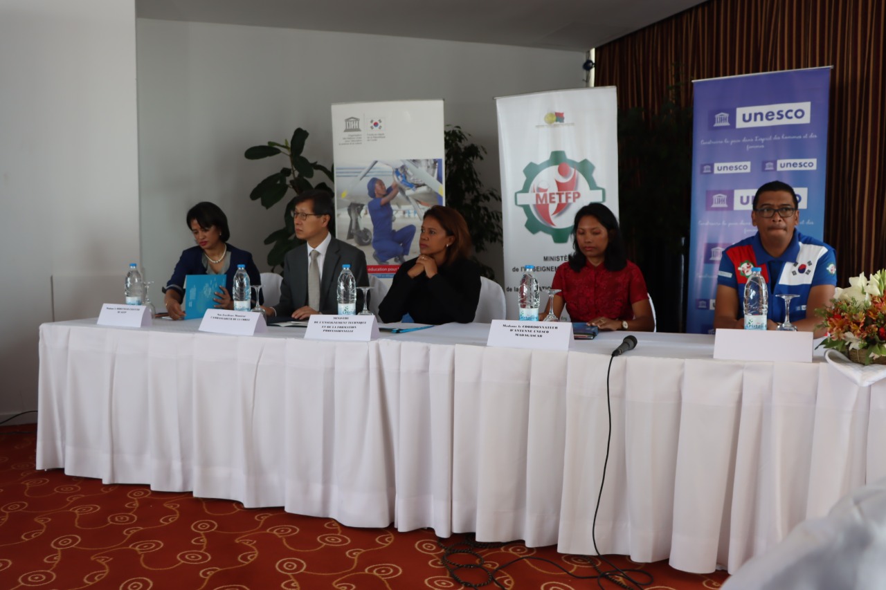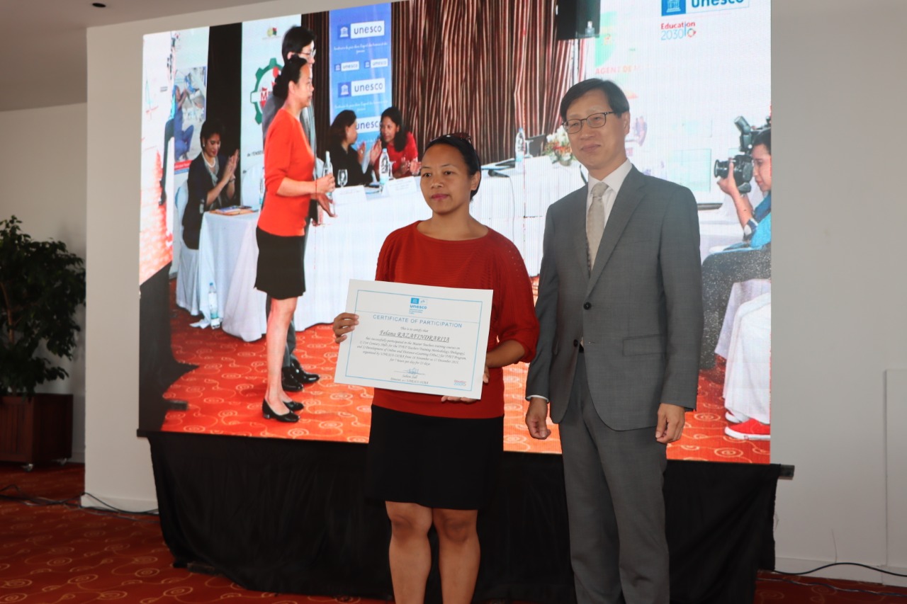 La céréminie de la fin du projet UNESCO BEAR II (Better Education for Africa’s Rise)s'est tenue à Antananarivo le 10 novembre. A cet occasion SEM. SON et Mme La ministère de l’Enseignement supérieur, de la Recherche et de l’Innovation ont remis les certificats aux maîtres formateurs de l'ETFP(L'enseignement et la formation techniques et professionels) Le projet UNESCO BEAR II a été mis en œuvre en 2017 dans le but de renforcer la formation professionnelle à Madagascar. Au total 2 millions de dollars ont été financés par le gouvernement coréen.