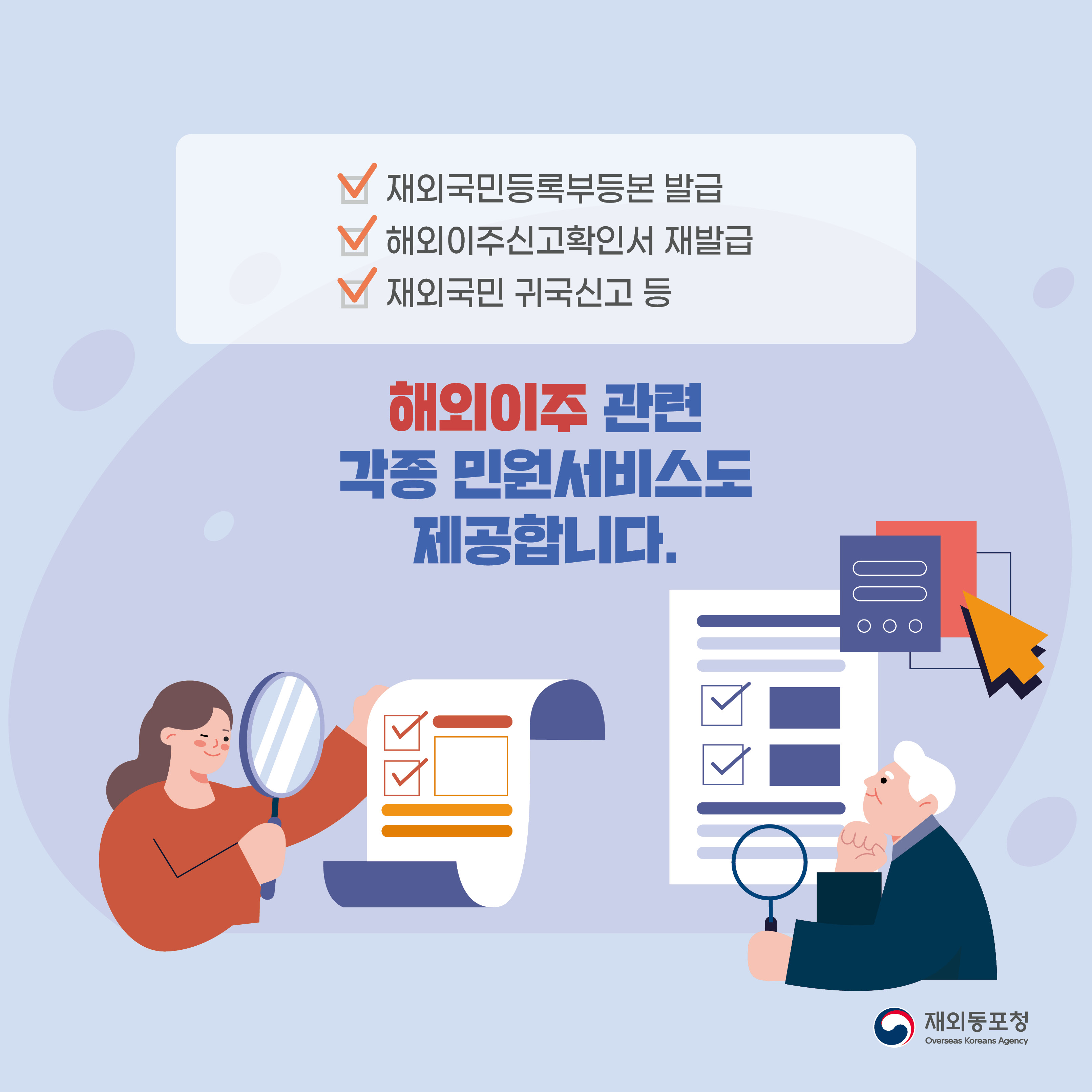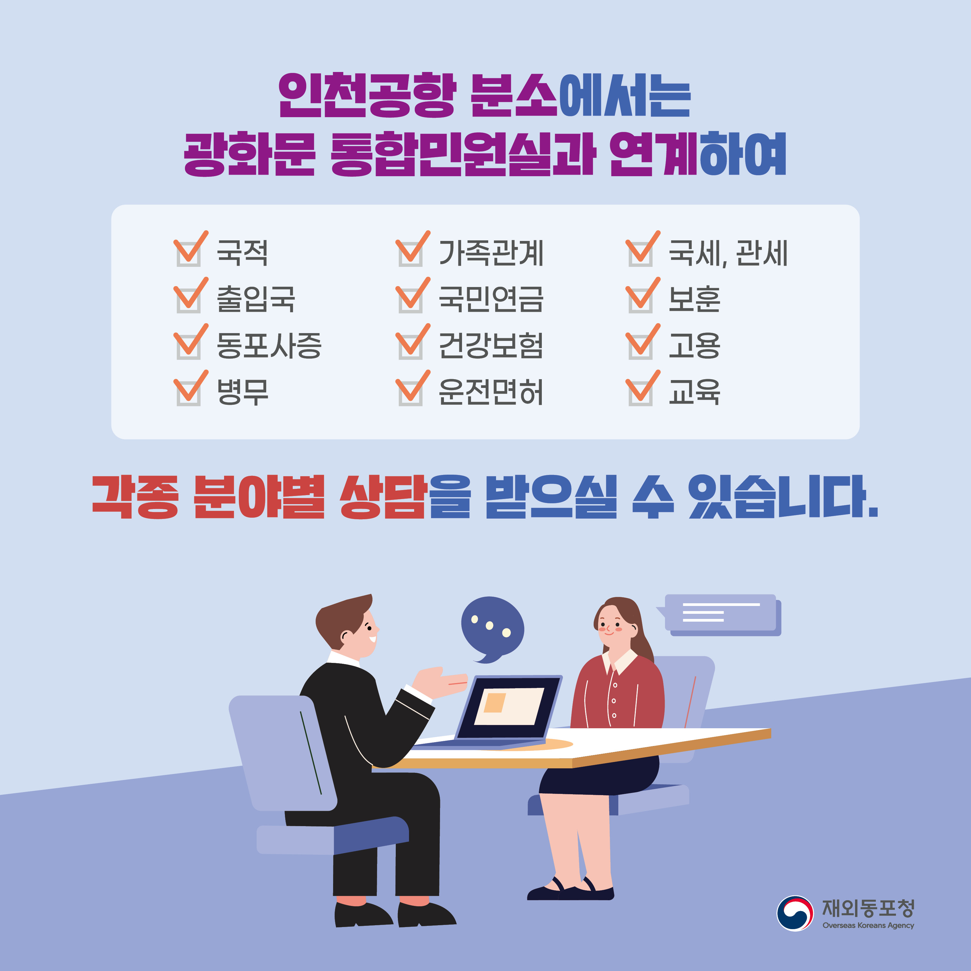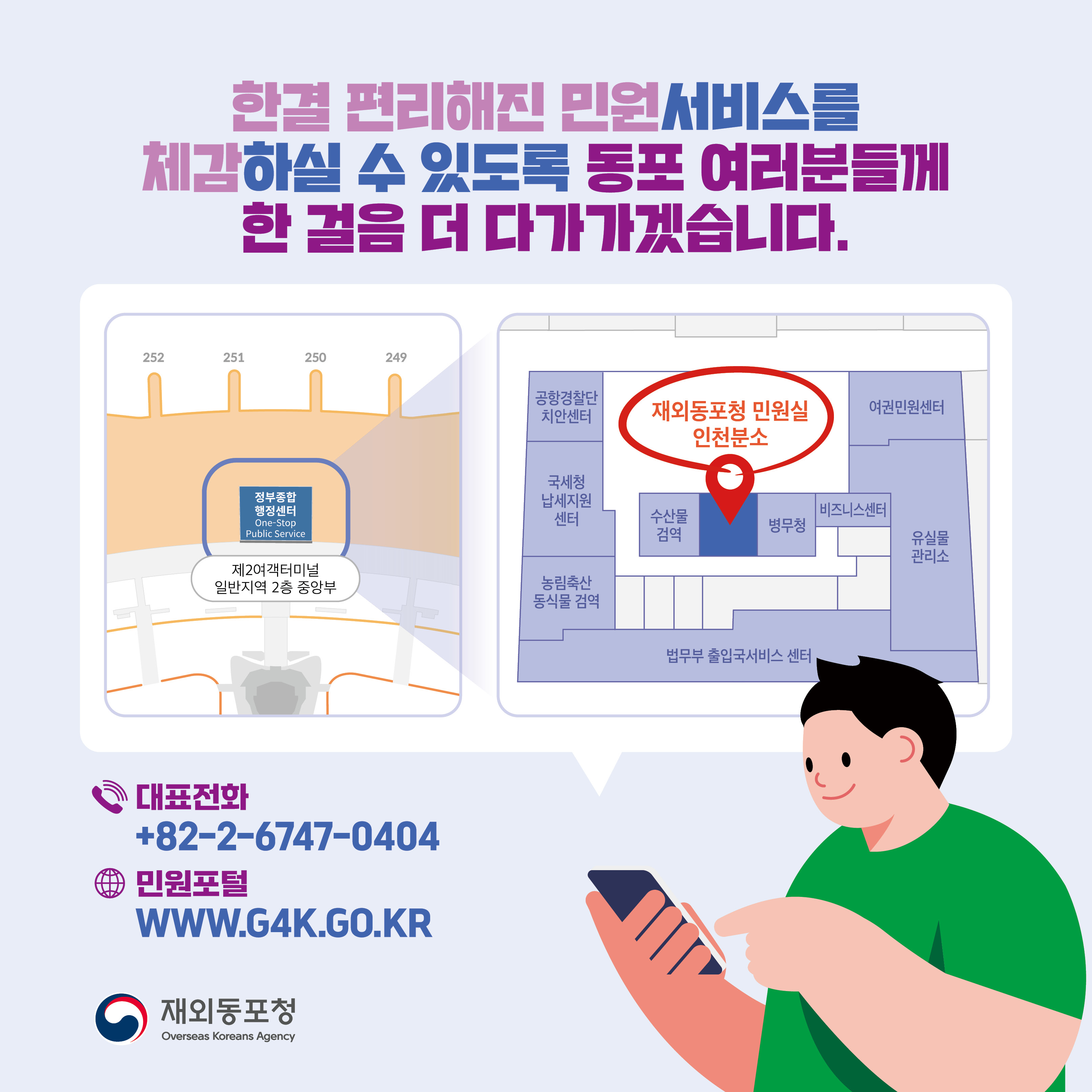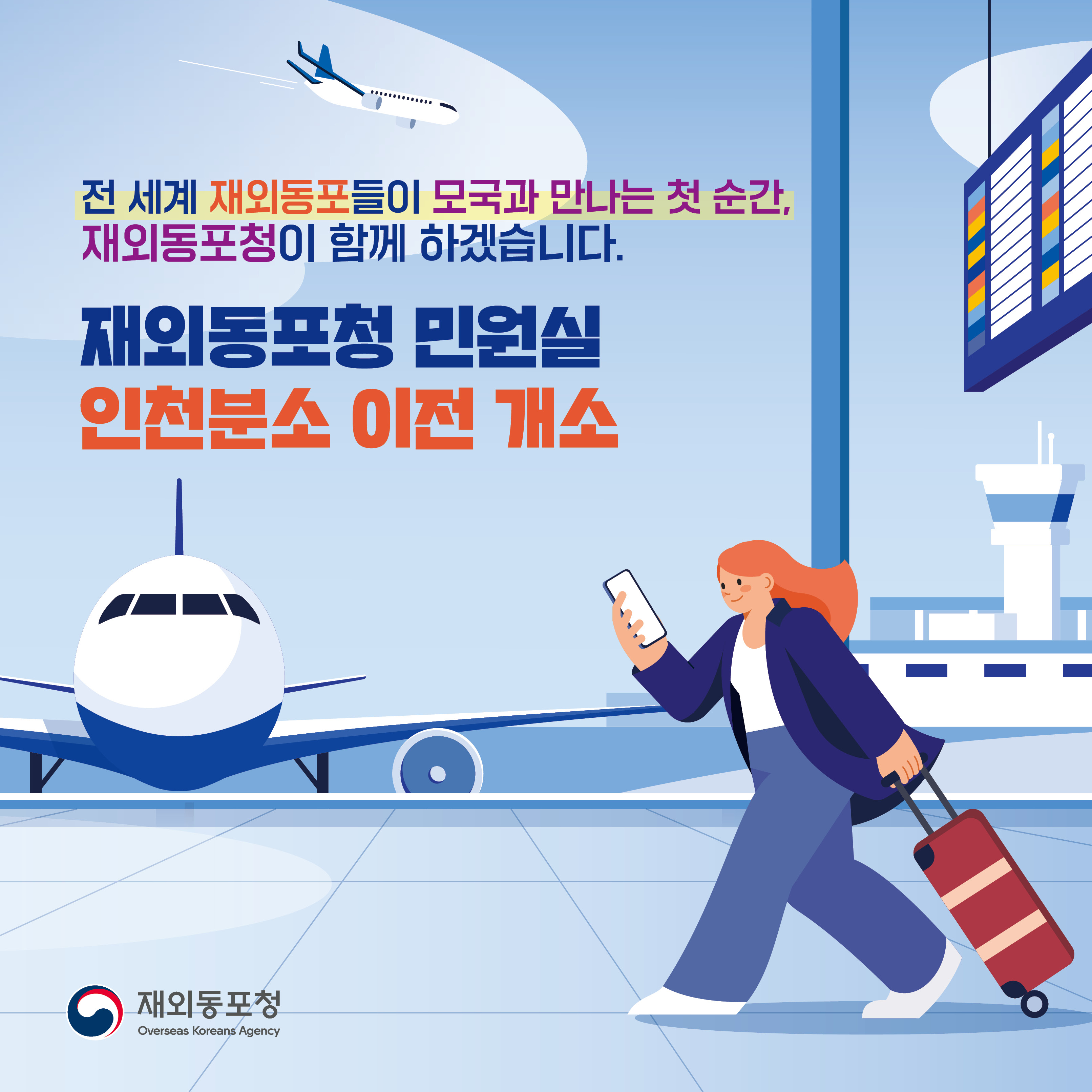 재외동포청은 출입국하는 재외동포들이 더욱 편리하게 민원서비스를 이용할 수 있도록 민원실 인천분소를 인천공항 제2여객터미널(2층 정부종합행정센터)에 설치하고, 12월 2일(월) 오전 9시부터 본격적으로 운영을 시작합니다.